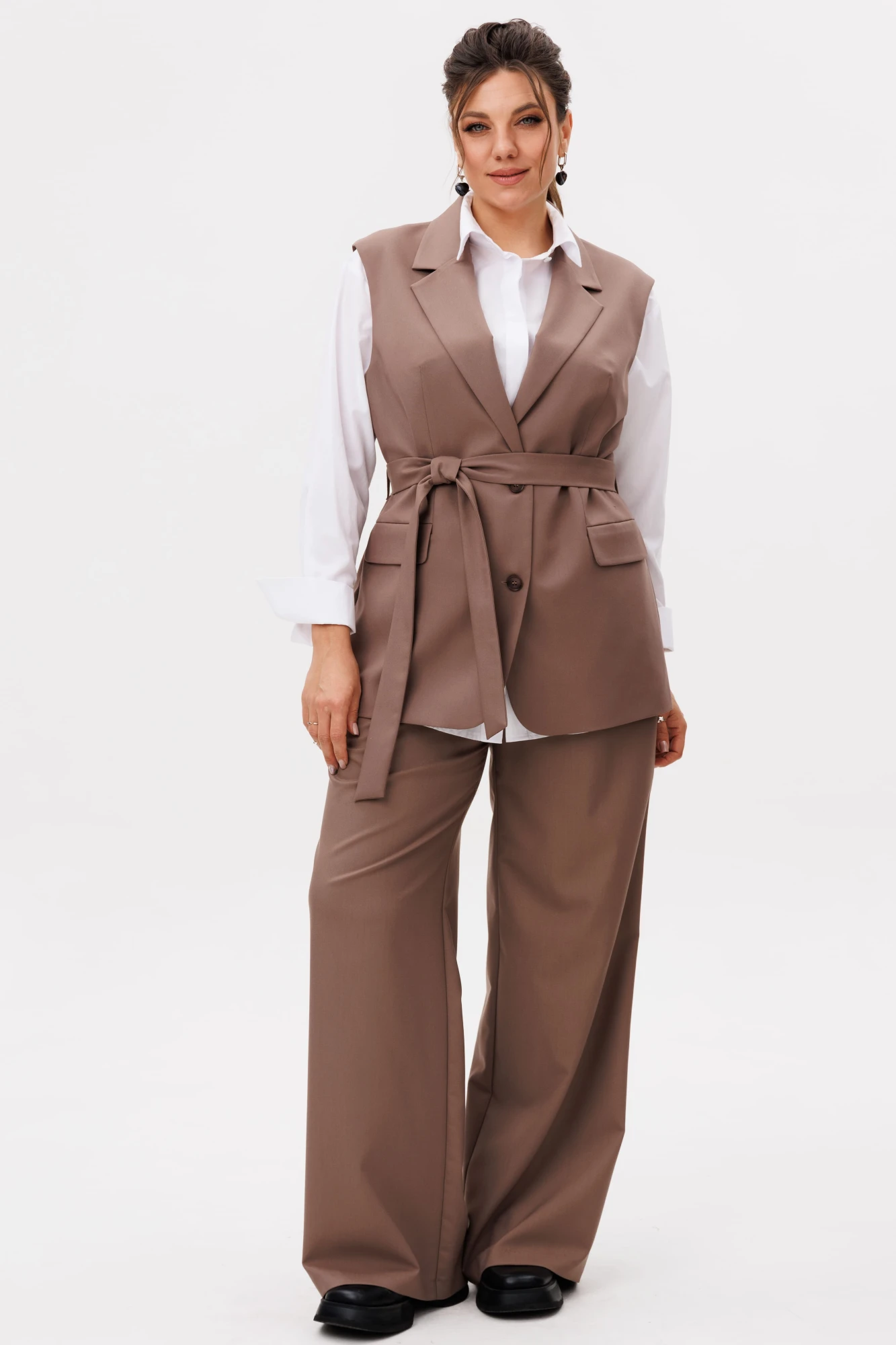 На модели в костюме цвета «кора дуба» белая рубашка 1403.1 и футболка 1280.