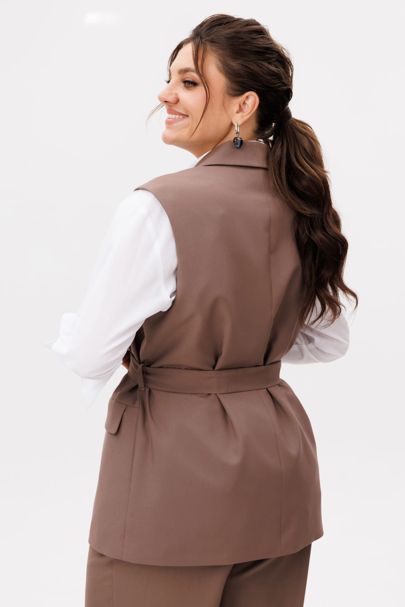 Прорезные карманы с клапанами не только делают жилет функциональным, но и подчеркивают его безупречный крой. Удлиненный пояс, плавно перетекающий в линию низа, визуально вытягивает силуэт, придавая ему еще больше элегантности.