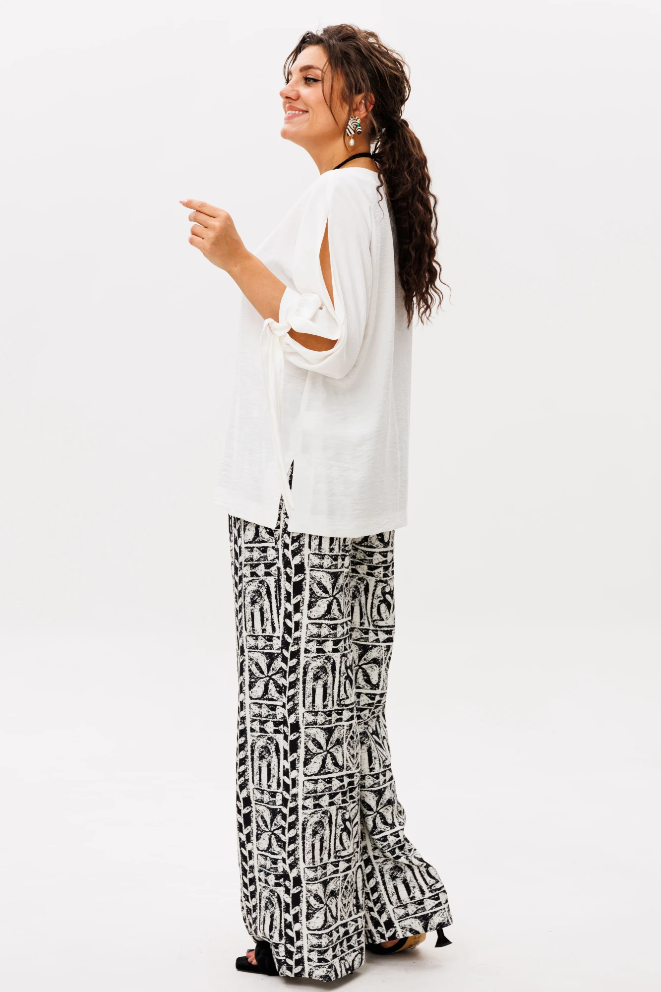 Брюки-палаццо сливочного оттенка — это воплощение комфорта и элегантности. Мягкая резинка бережно облегает талию, а скрытые боковые карманы добавляют практичности без ущерба для линий. Широкий крой струится по фигуре, создавая эффект невесомости и роскоши.