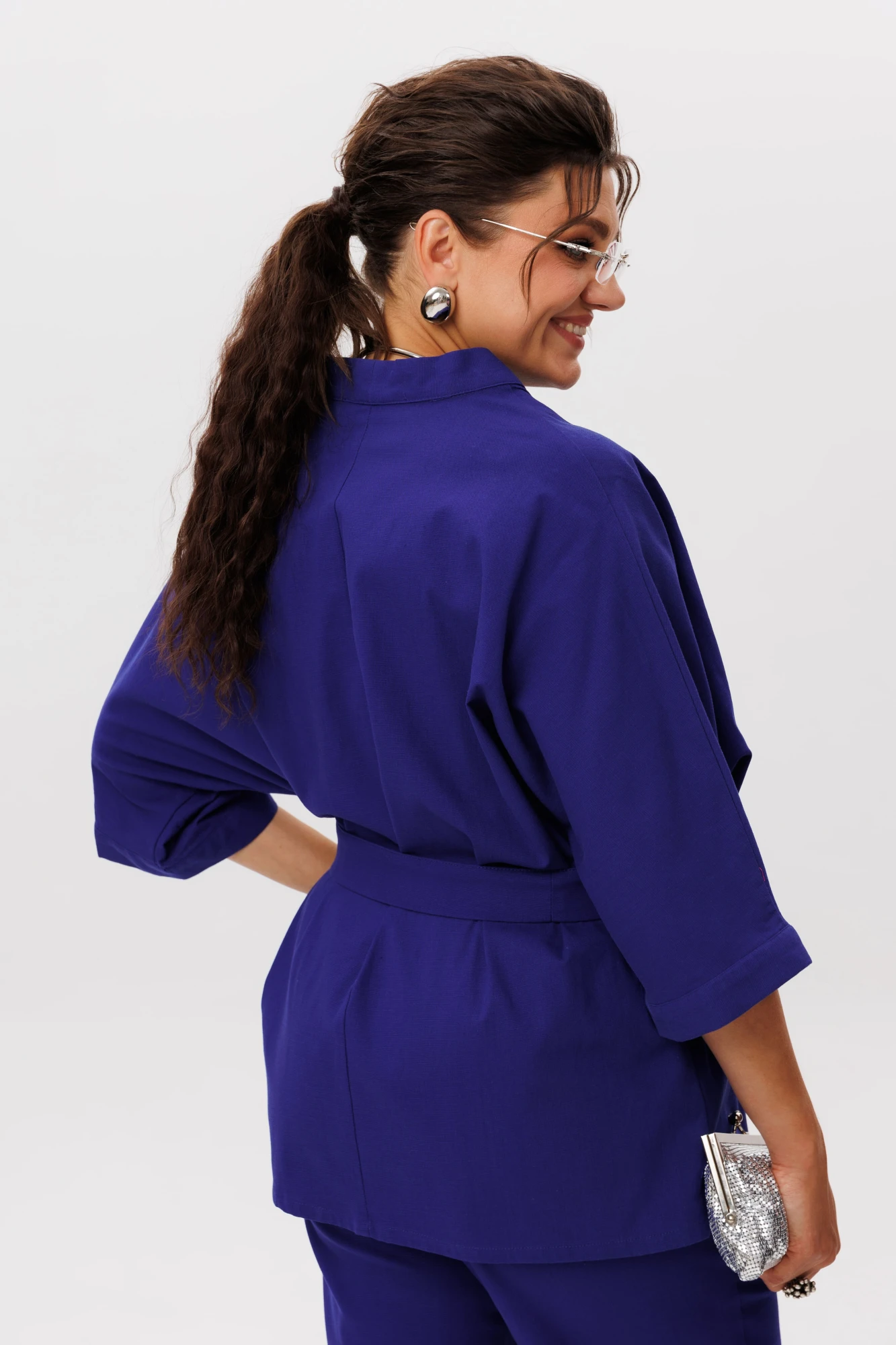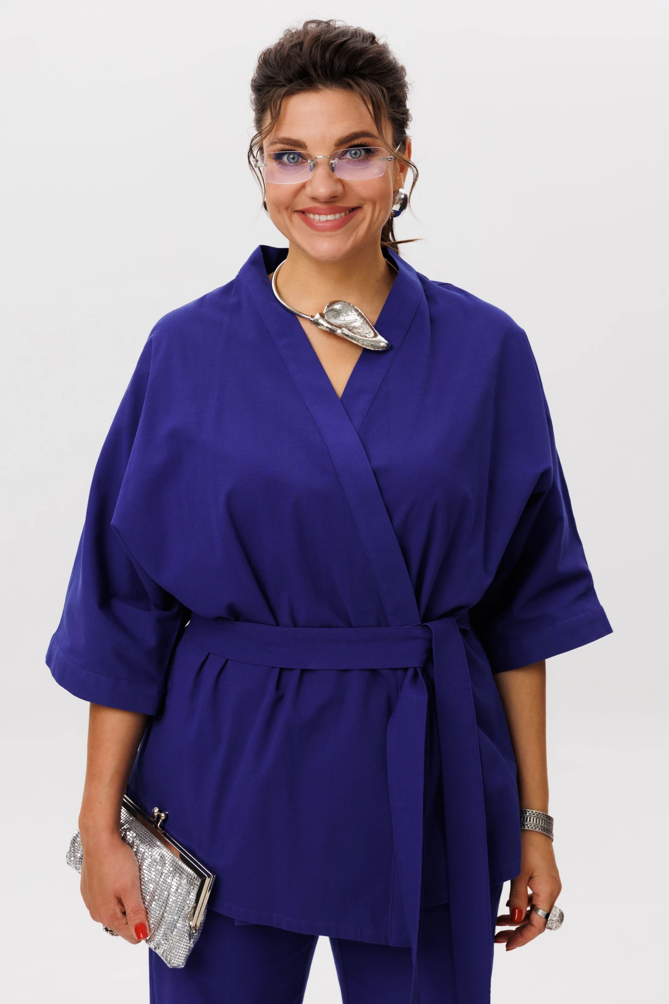 52, 54 , 56Кимоно свободного кроя с фигурным запахом мягко драпируется, подчёркивая силуэт, но не сковывая его. Рукав 3/4 с широкой манжетой добавляет динамики, а отсутствие застёжек делает образ ещё более непринуждённым. Съёмный пояс позволяет варьировать степень выразительности.