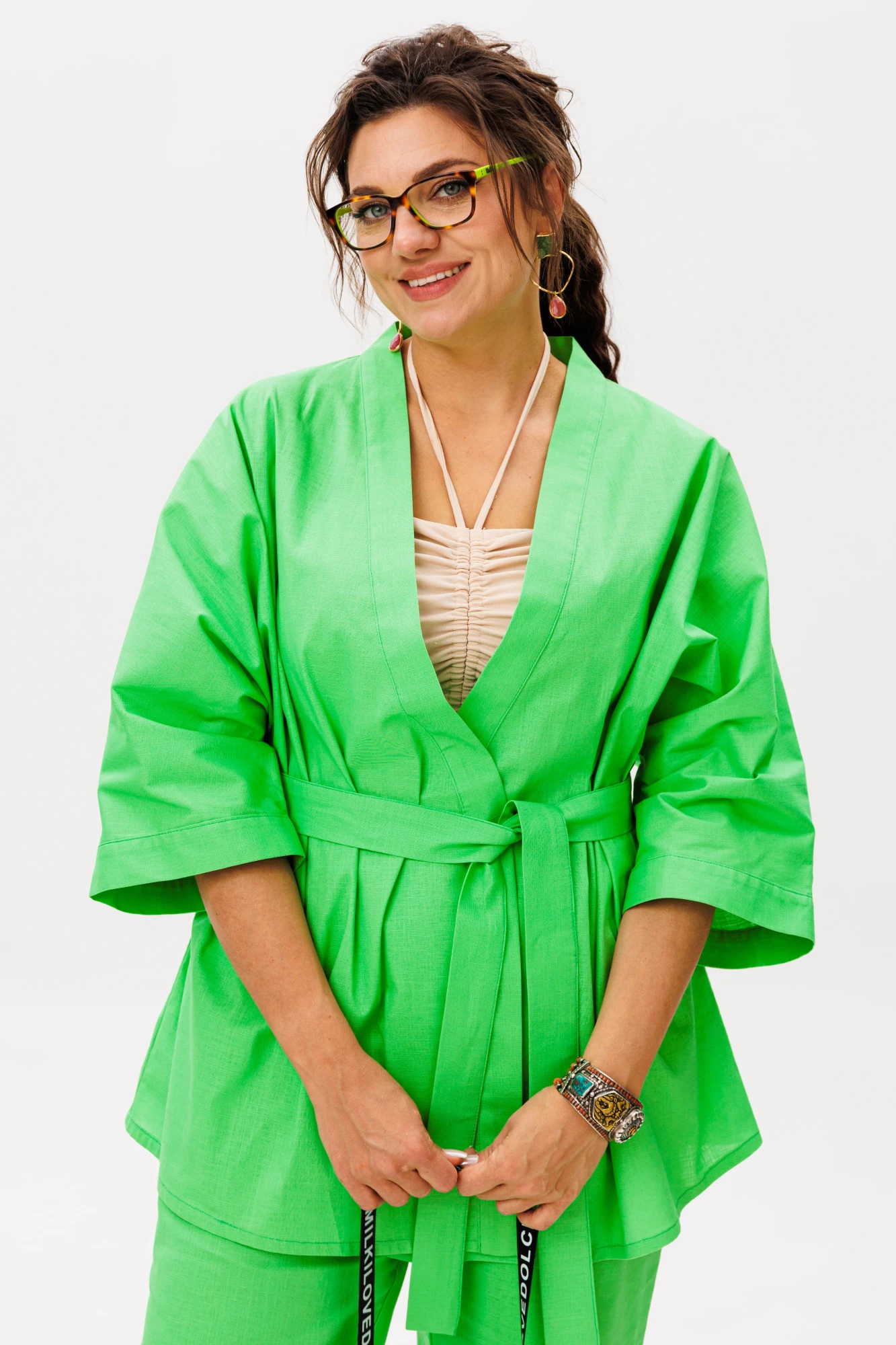 Кимоно свободного кроя с фигурным запахом мягко драпируется, подчёркивая силуэт, но не сковывая его. Рукав 3/4 с широкой манжетой добавляет динамики, а отсутствие застёжек делает образ ещё более непринуждённым. Съёмный пояс позволяет варьировать степень выразительности.
