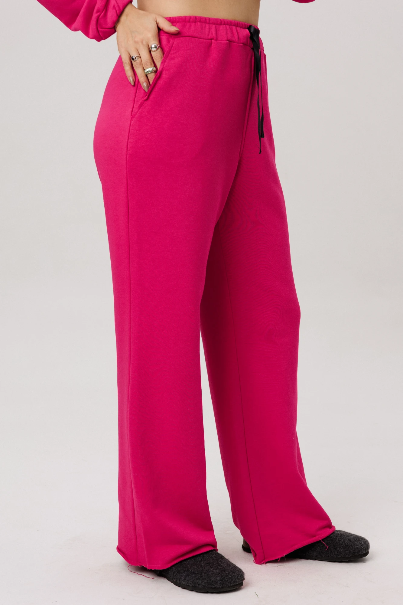 Брюки продолжают философию комфорта, предлагая прямую посадку на эластичном поясе, который мягко сидит по фигуре, не стесняя движений. Лаконичный дизайн дополнен практичными боковыми карманами. Подлинной изюминкой всего комплекта становятся намеренно открытые срезы, привносящие в образ ноту дерзкого шика.
