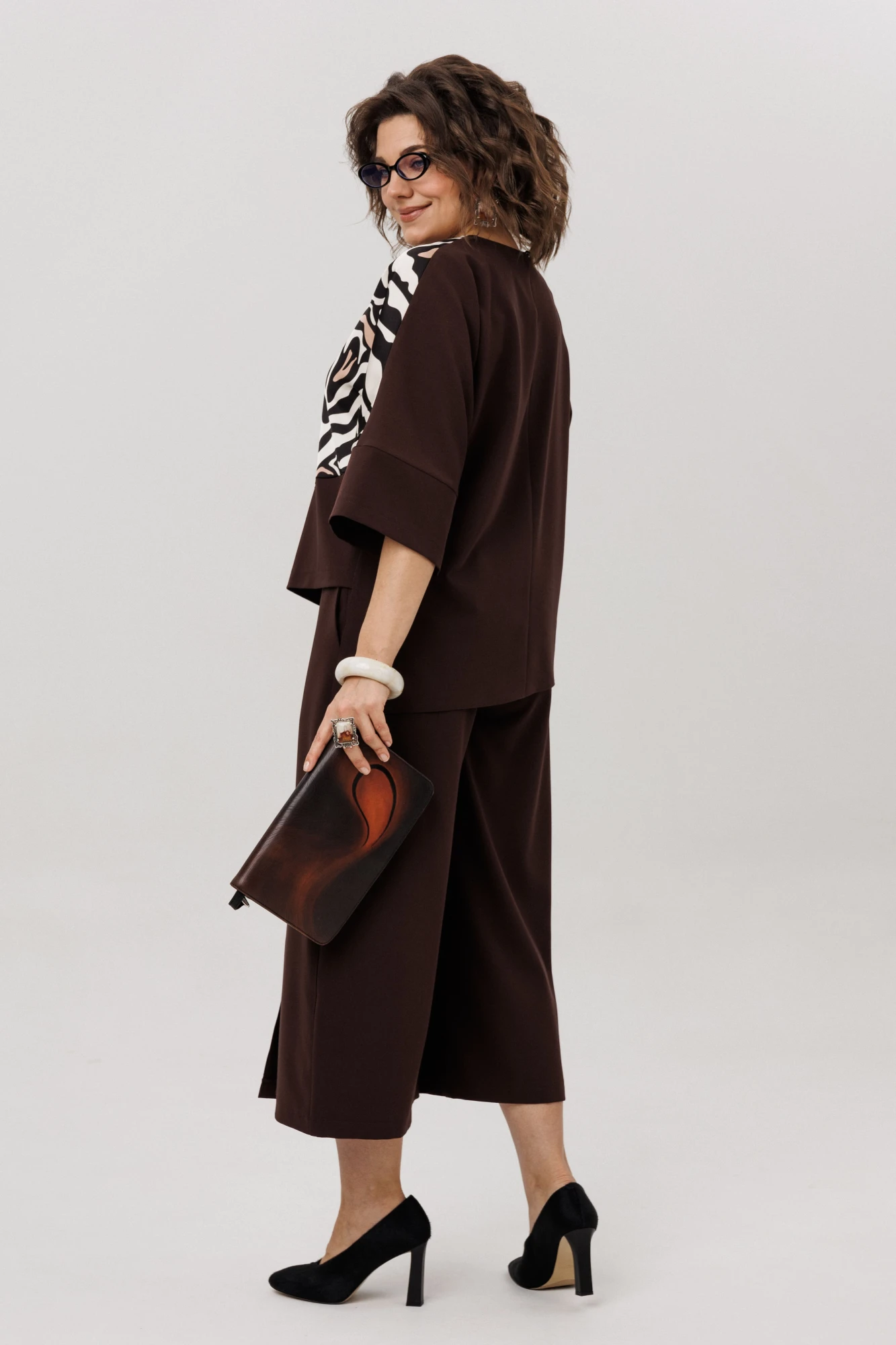 Сочетание строгого силуэта и лёгкой небрежности в цвете «древесная змея». Его основу составляет блузон шоколадного оттенка, оживлённый тонким змеиным узором. Он свободно обрисовывает фигуру, смягчая линии цельнокроеными рукавами. А его главная деталь - фигурный, словно волной очерченный низ, который придаёт статичному крою неожиданную динамику.
