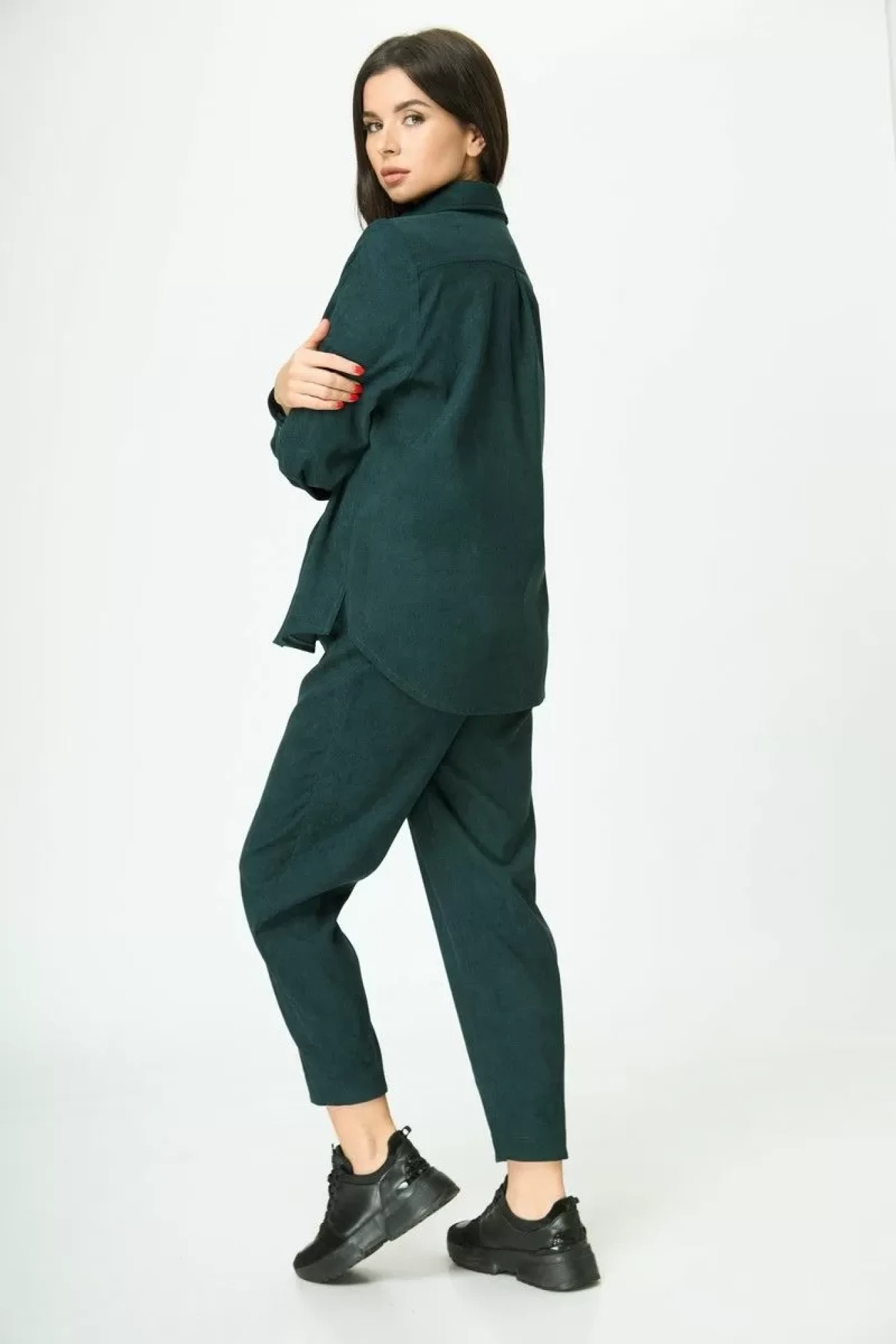 Зауженные книзу за счёт вытачек по передним и задним частям. На передних частях брюк обработаны карманы с отрезным бочком.