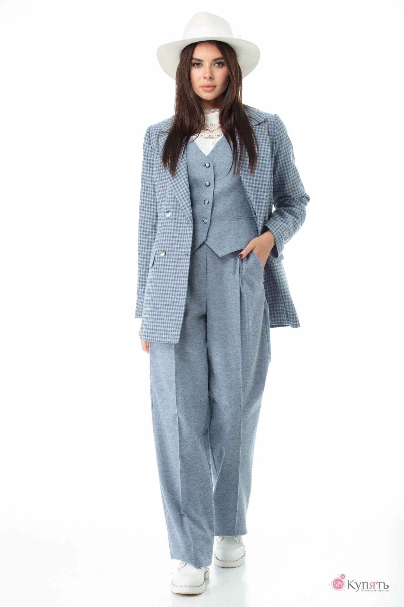 Комплект выполнен из ткани с компаньоном: однотонные брюки и жилет, жакет в клеточку.