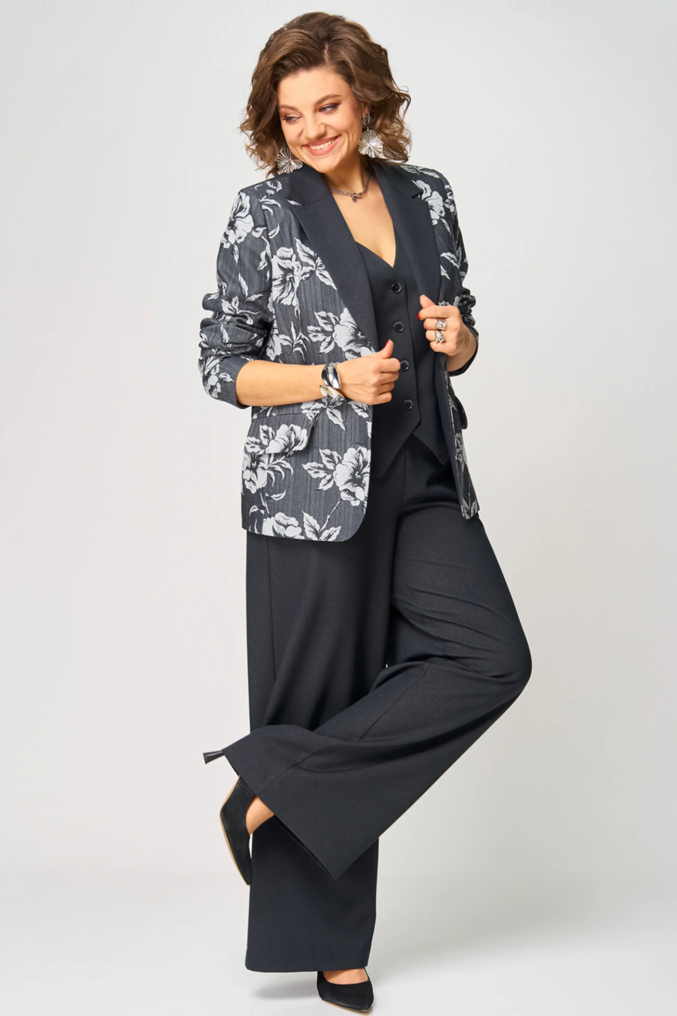 Однобортный жакет полуприталенного силуэта, на подкладке, с плечевыми накладками. Воротник пиджачного типа с отложными лацканами. По переду центральная застежка на петли и пуговицы и прорезные карманы с клапаном, талиевые вытачки и рельефы. Низ бортов закругленной формы. Спинка со средним швом и рельефами. Рукав втачной двухшовный длинный.