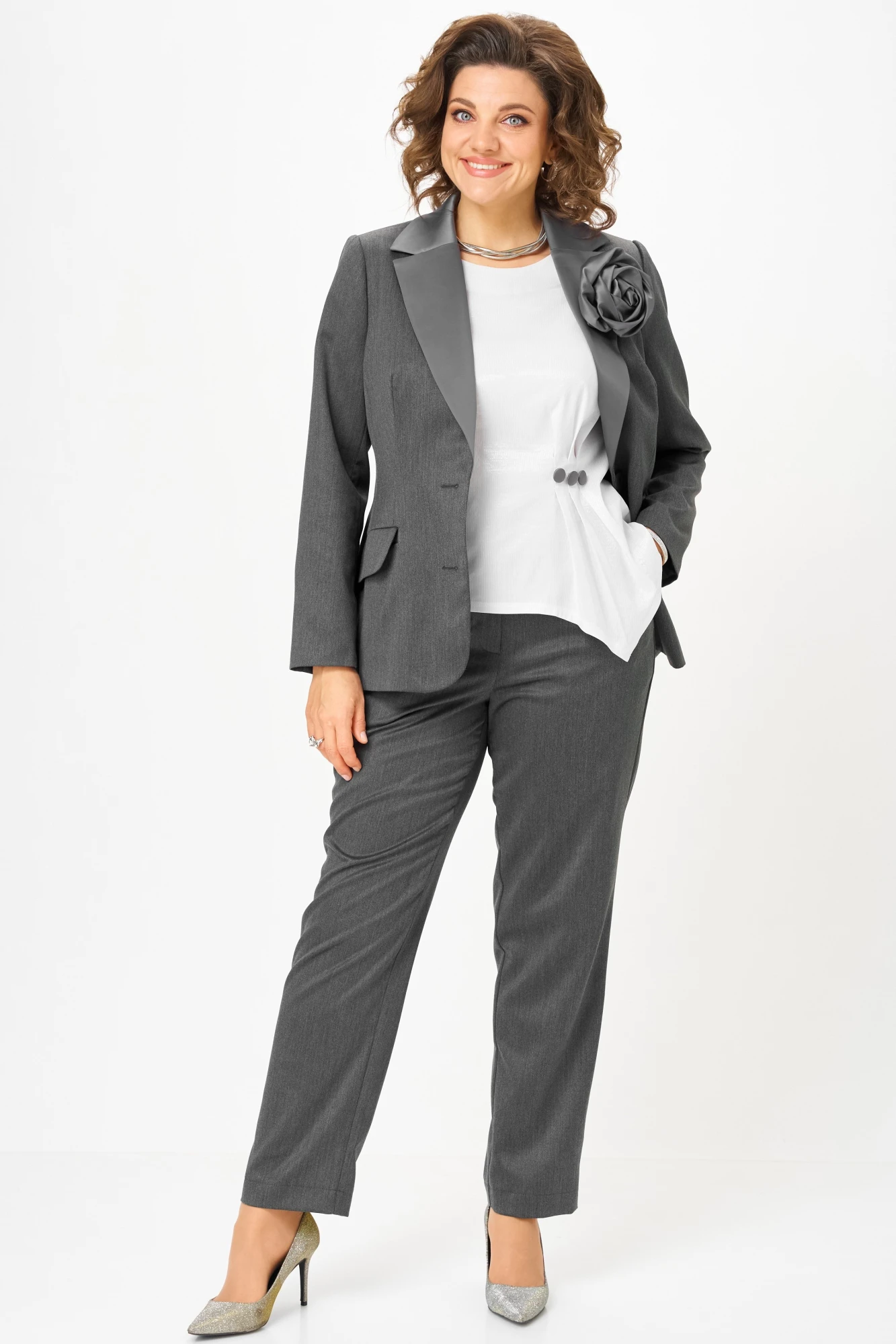 Однобортный жакет полуприталенного силуэта, на подкладке, с плечевыми накладками. Воротник пиджачного типа с отложными лацканами. По переду центральная застежка на петли и пуговицы и прорезные карманы с клапаном, талиевые вытачки и рельефы. Низ бортов закругленной формы. Спинка со средним швом и рельефами. Рукав втачной двухшовный длинный.