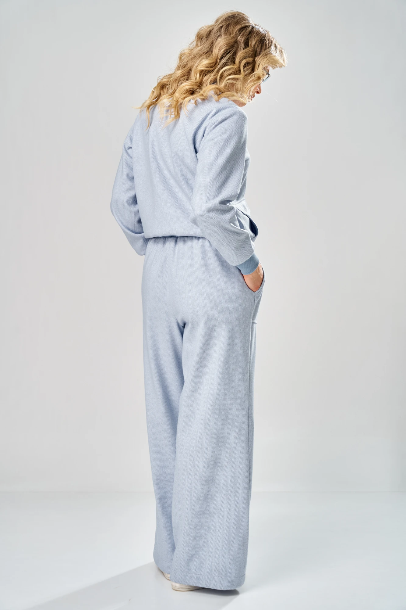 Комплект женский состоит из брюк и бомбера, выполнен из текстильной ткани. Брюки прямого силуэта, с притачным поясом. Внутри пояса эластичная тесьма, и проложены две строчки. По центру переда пояса обработаны две прорезные петли, в которые протянут шнур. На передних половинках брюк обработаны боковые накладные карманы с косым входом. Задние половинки брюк без конструктивных элементов. Бомбер на подкладке, свободного силуэта с притачной по низу планкой из отделочной ткани. Внутри планки эластичная тесьма. Застежка центральная бортовая на 7 кнопок. Бомбер с воротником-стойка из отделочной ткани. Перед с накладным карманом и клапаном с одной кнопкой. Рукава на спущенной пройме, длинные, одношовные с притачной по низу манжетой из отделочной ткани. Длина жакета по спинке 66см, длина рукава 60 см, длина брюк 111 см.