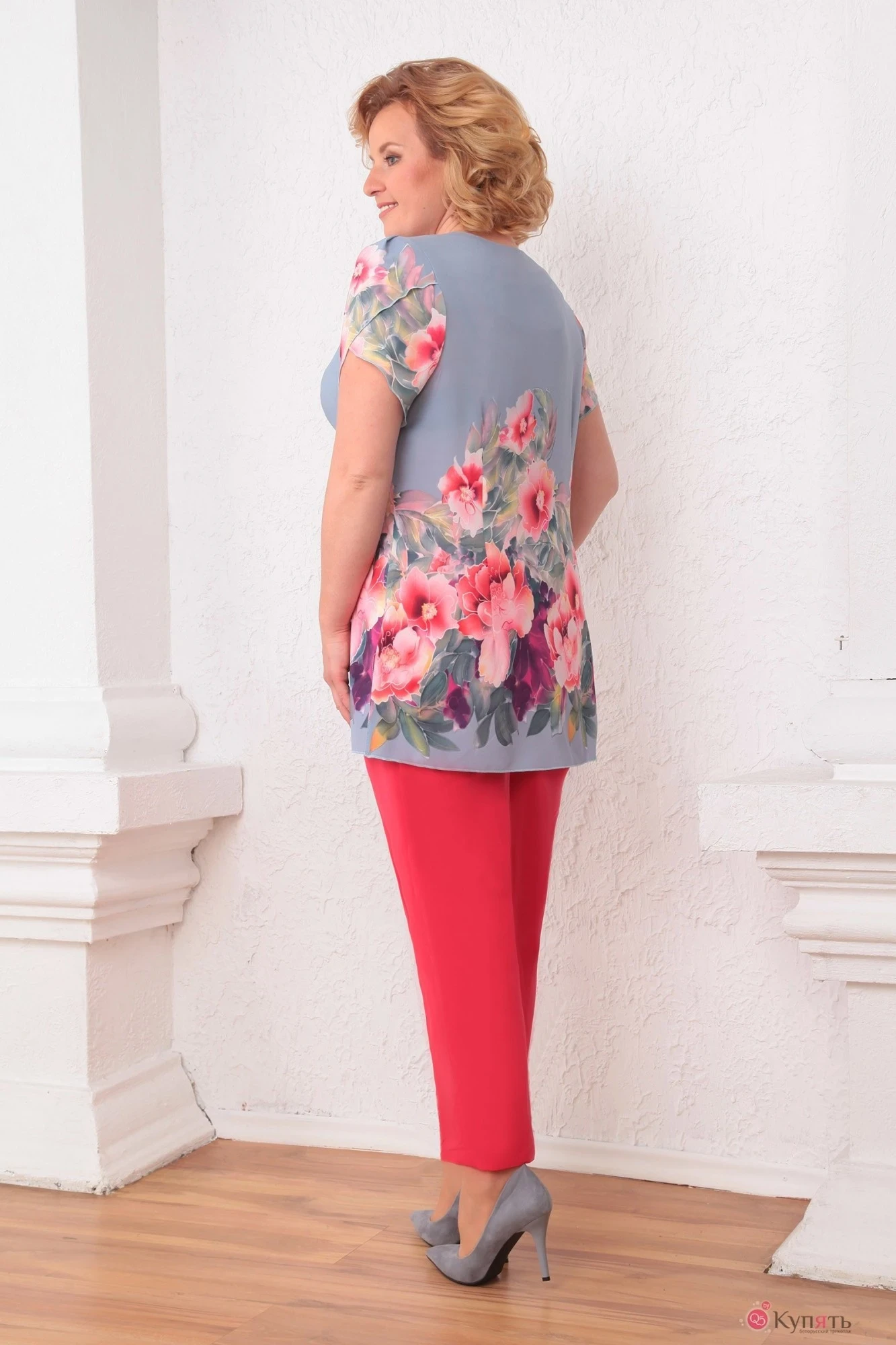Комплект женский полуприлегающего силуэта, состоящий из блузки и брюк. Блузка непрозрачного стрейчевого шифона, брюки из стрейчевой ткани брючной ткани. Горловина блузки фигурная, на планках. По переду рельефы из проймы из проймы до низа, по спинке талиевые вытачки. Рукав со складками, состоящий из двух частей, заходящих друг на друга. Брюки 7-8, на поясе, с резинкой сзади. Застёжка на гульфик, по поясу на петлю и пуговицу.
