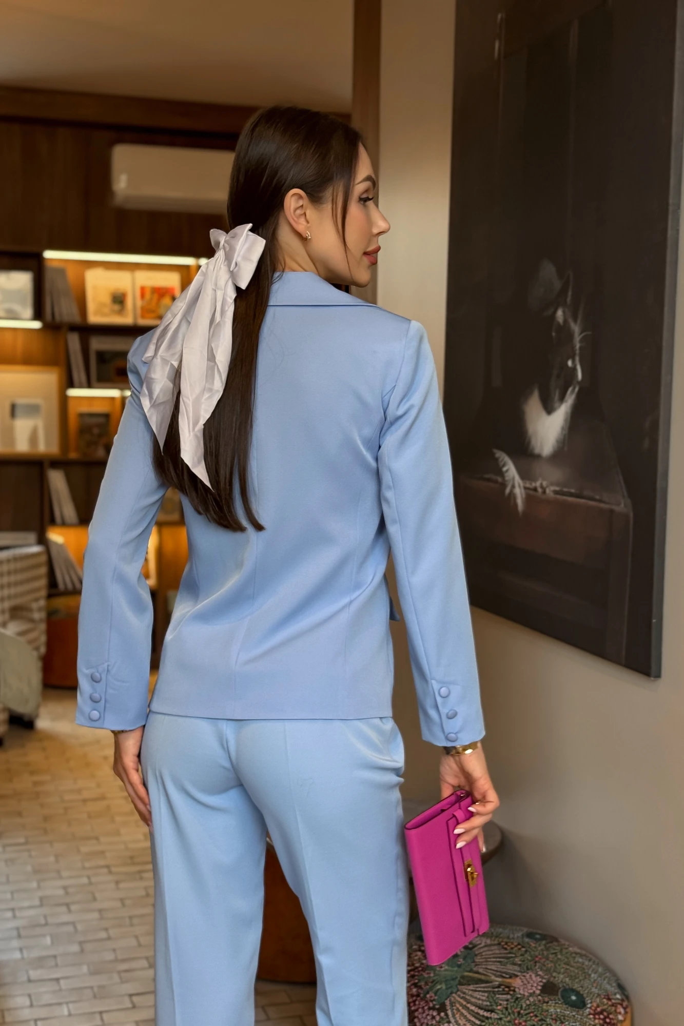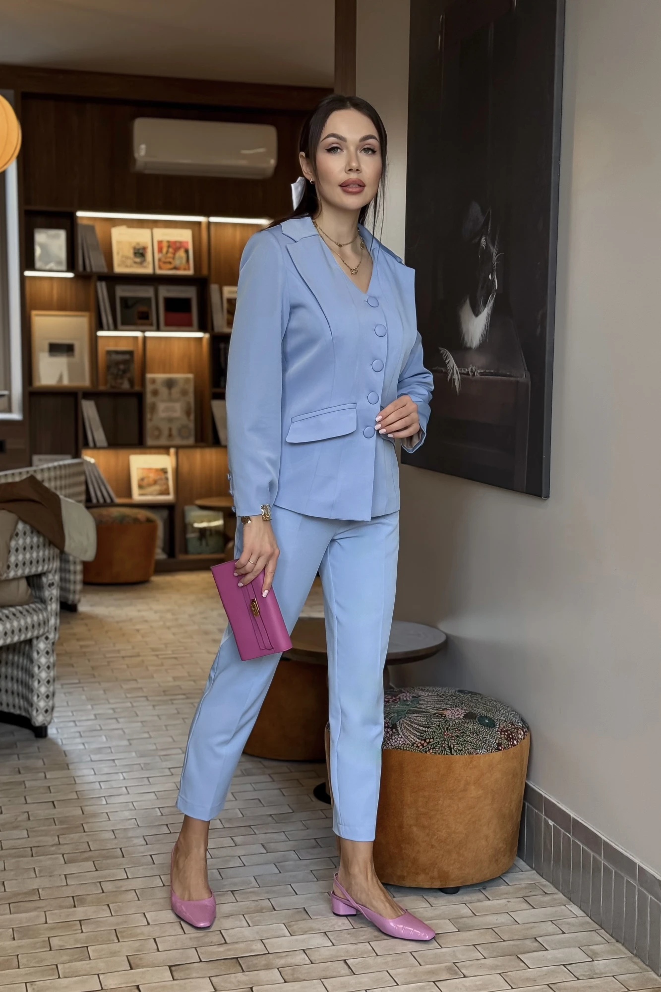 Жакет однобортный, обработан подкладкой. Рукав втачной, одношовный, прямой, обработан шлицей с пуговицами. По переду имеются рельефы, карманы оработаны клапанами. Воротник классический, исходящий из рельефов. Пуговицы в цвет изделия Брюки прямого кроя, длинна 7/8, застёжка- гульфик , по боковым швам обработаны карманы