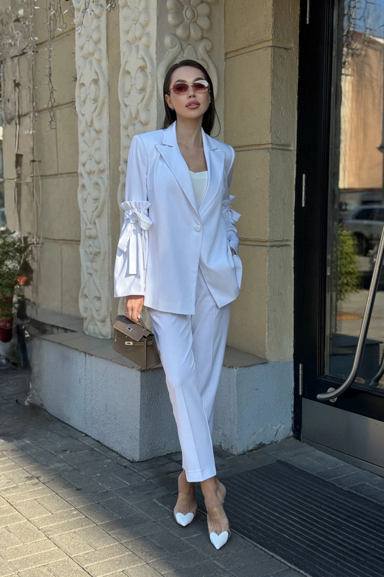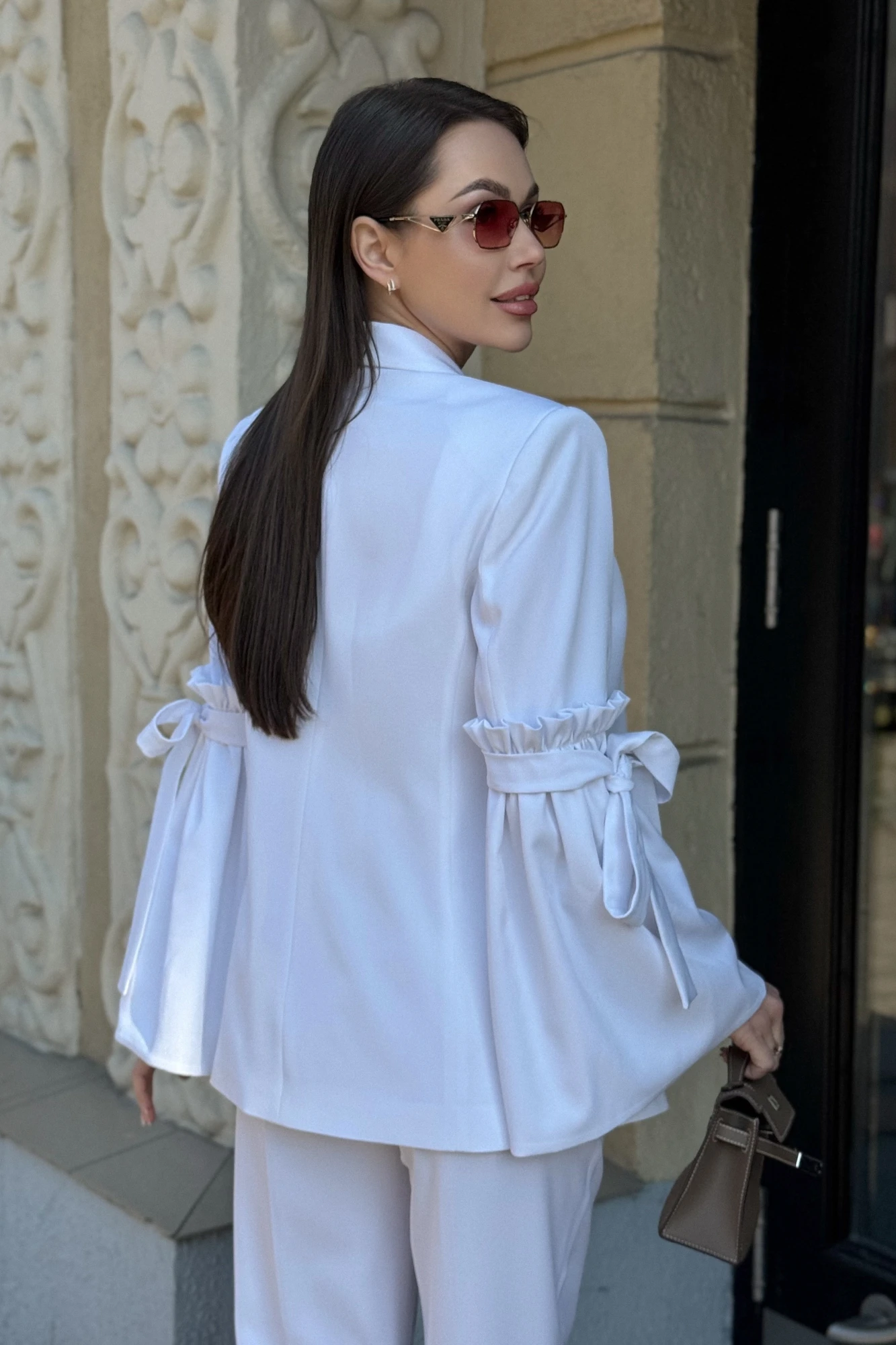 Жакет однобортный свободнго силуэта. Жакет обработан подкладкой. Рукав прямой, длинный, втачной, отрезной с пришитой присборенной деталью, шнурком из основной ткани для завязывания.