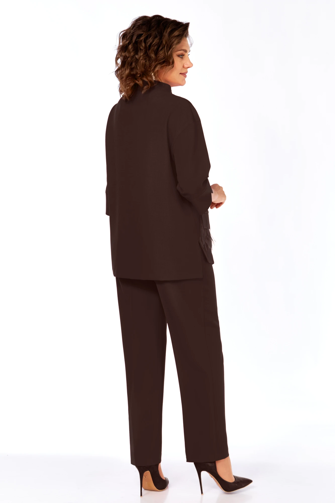 Жакет прямого силуэта с асимметричной застёжкой на 4 петли и пуговицы.Воротник-стойка цельнокроеный.Плечи спущены.Рукава длиной 3/4 одношовные,низ на притачных манжетах внахлёст. Спинка цельная.На переде клапан с декоративной тесьмой с перьями (для стирки рекомендуется снять).Низ переда фигурный.По бокам разрезы.Жакет без подкладки.