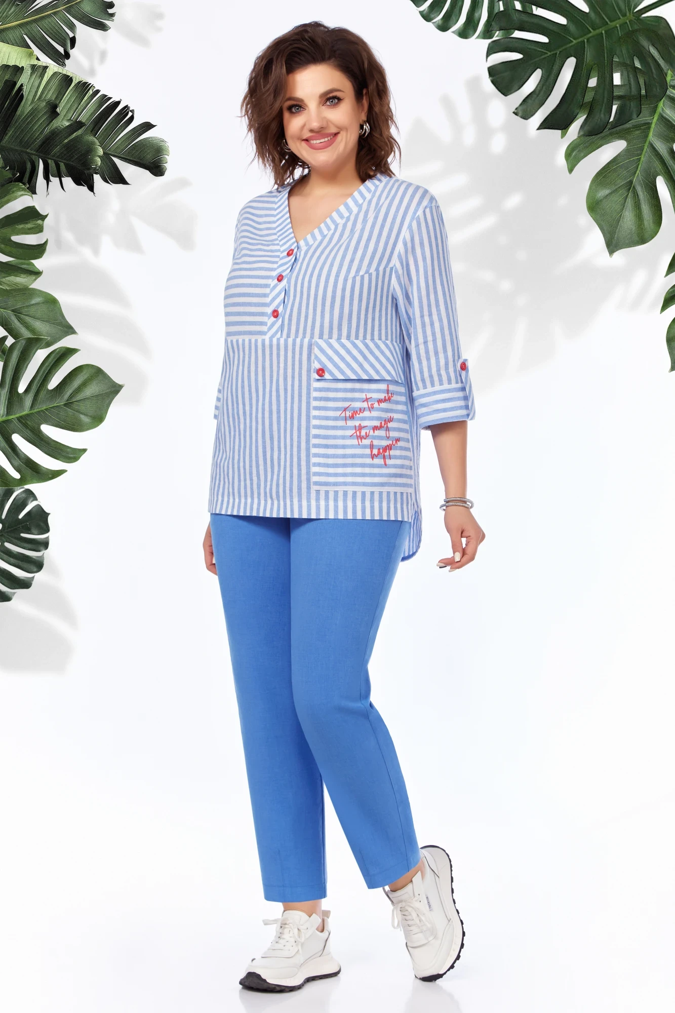 52,54,56,58, 60 ,62Блуза прямого силуэта, выполнена из рубашечной ткани в полоску.Перед с нагрудными вытачками,горизонтальным подрезом ниже линии груди и накладным карманом с печатью и клапаном с декоративной пуговицей. Застёжка центральная на 3 петли и 3 пуговицы.Вырез горловины V-образный.Спинка удлинённая, с отрезной кокеткой и декоративным элементом с печатью.Пройма слегка спущена.Рукава одношовные, длиной 3/4,на отложных притачных манжетах с патами и декоративными пуговицами.Низ ассимметричный ,по бокам разрезы.