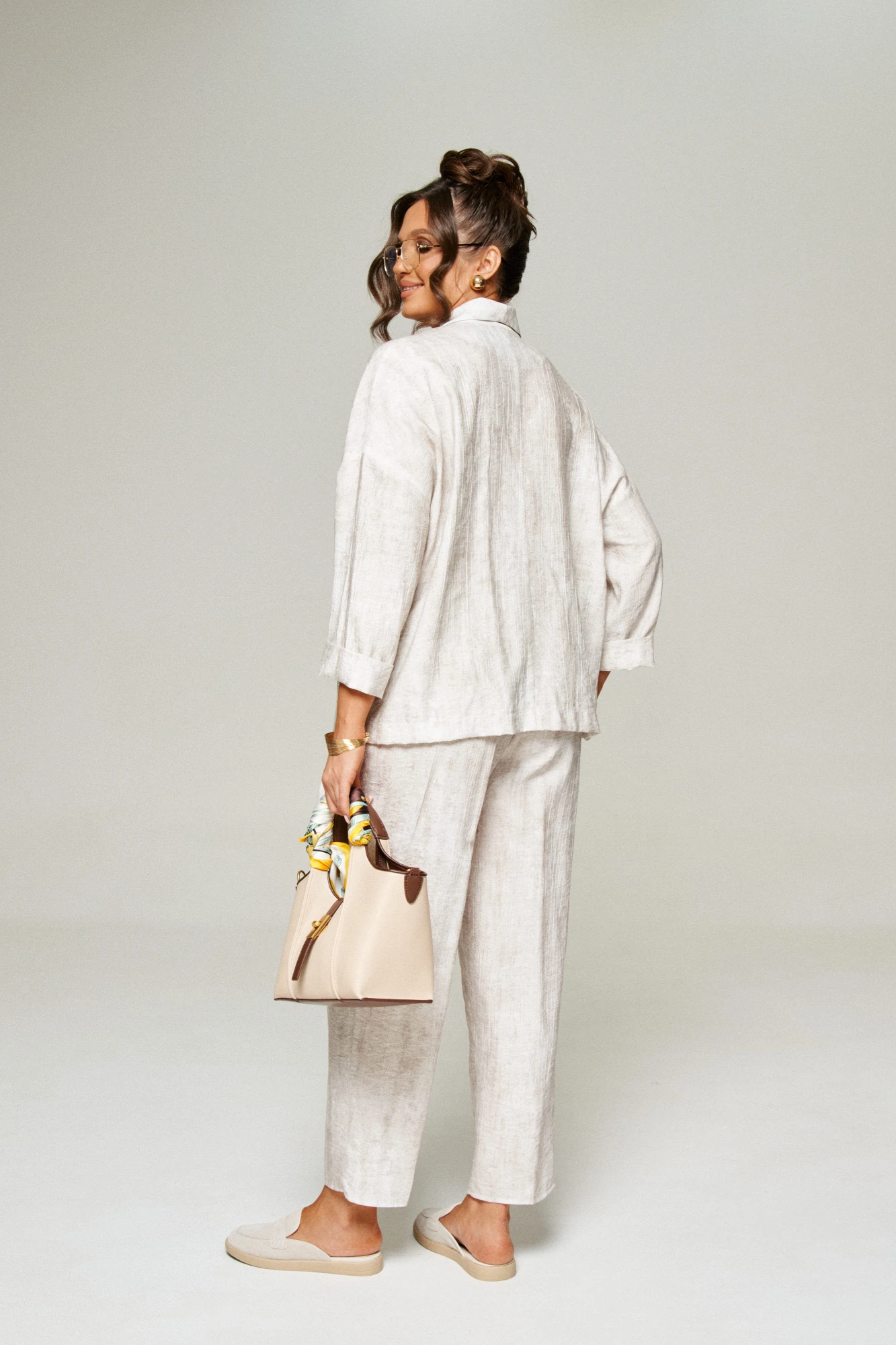 Брюки прямого силуэта свободные вверху и слегка зауженные к низу, длиной до щиколотки, с двумя верхними боковыми карманами и двумя заложенными глубокими складками от пояса спереди.