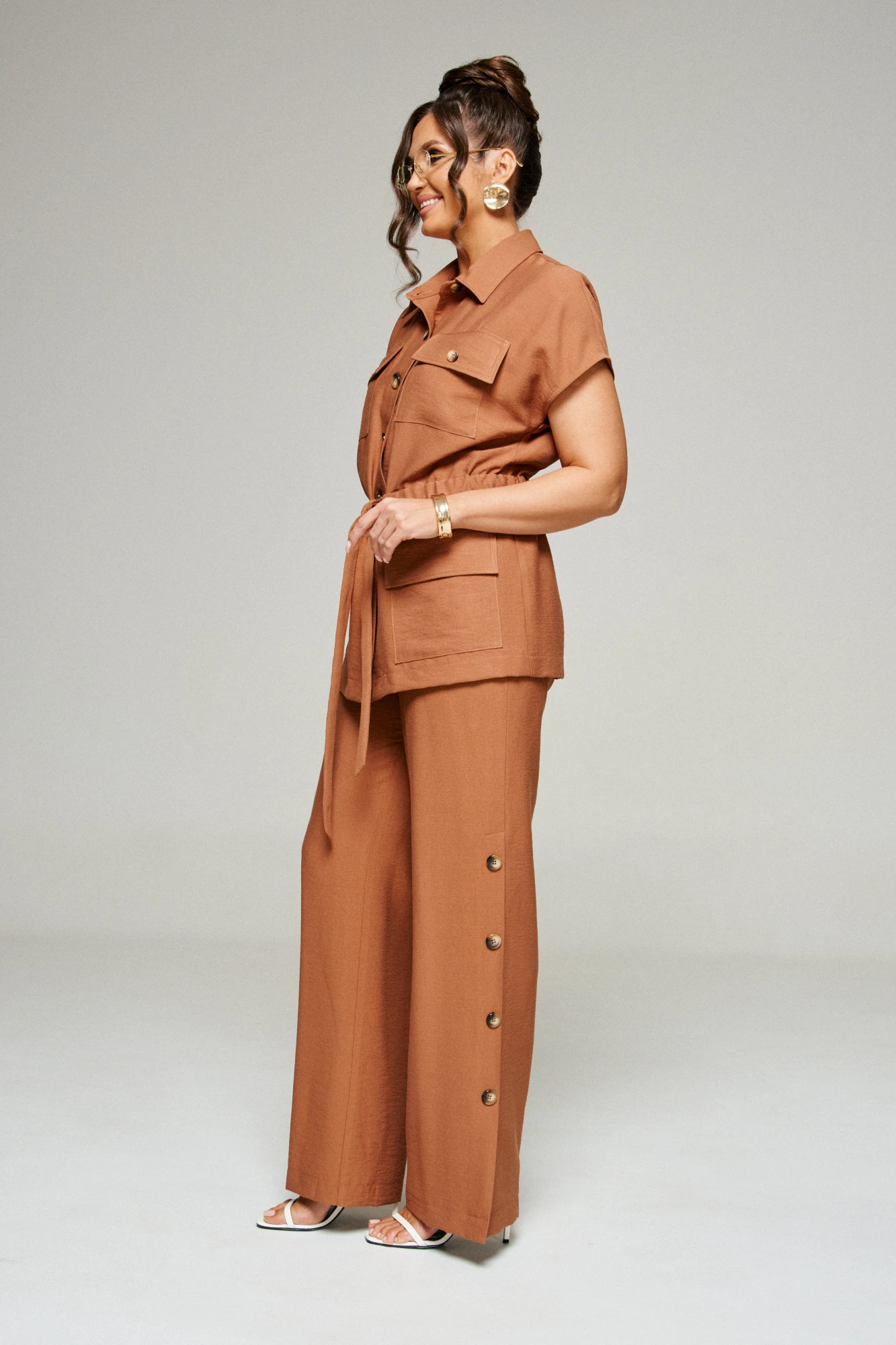 Стильный костюм состоит из жакета-рубашки и брюк, выполнен из мягкой ткани с волокнами льна и вискозы, практичен в носке.