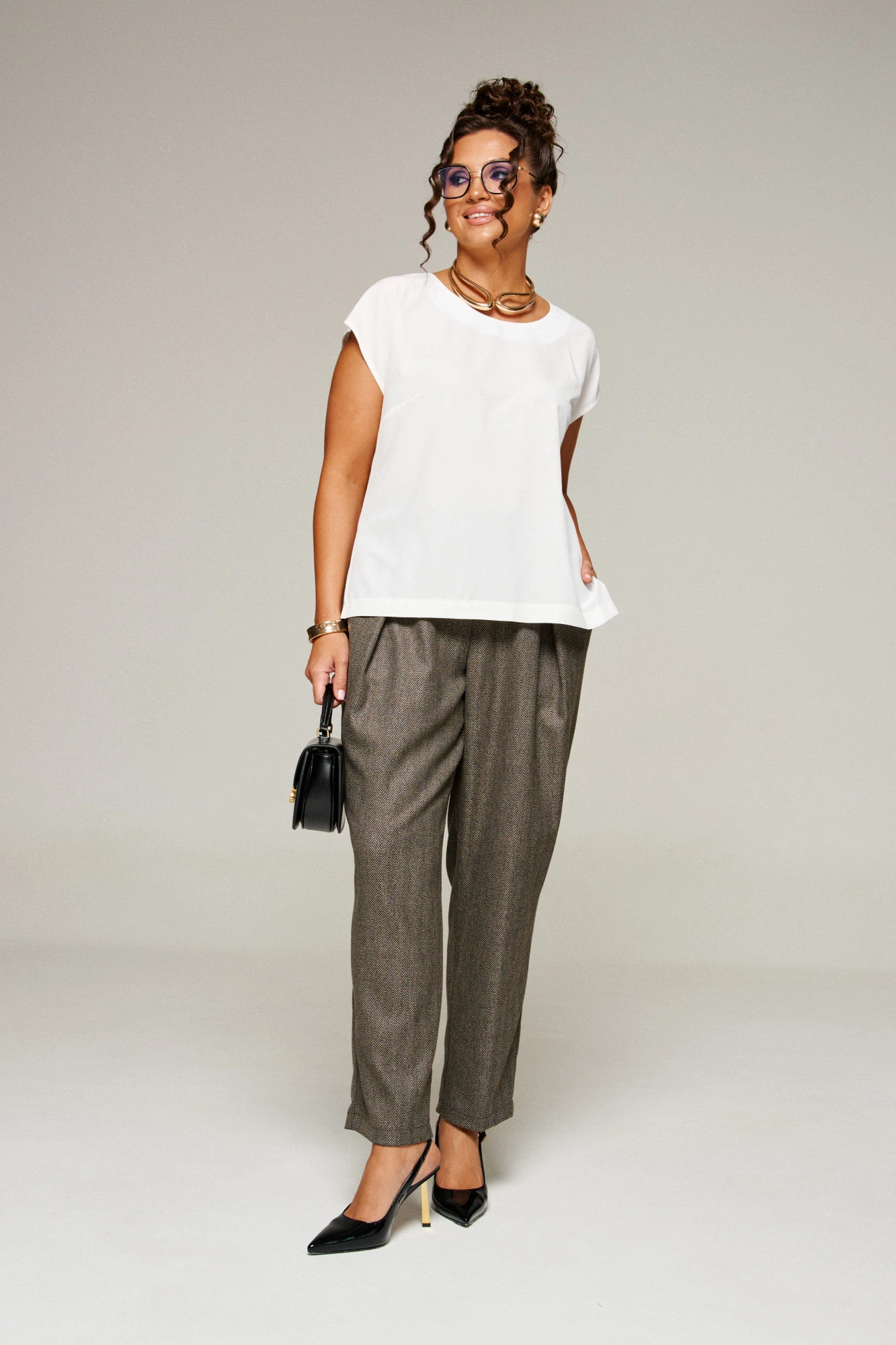 Брюки свободного силуэта расширенные вверху и слегка зауженные к низу, длиной до щиколотки, с двумя верхними боковыми карманами и двумя заложенными глубокими складками от пояса спереди. Высота сиденья классическая.