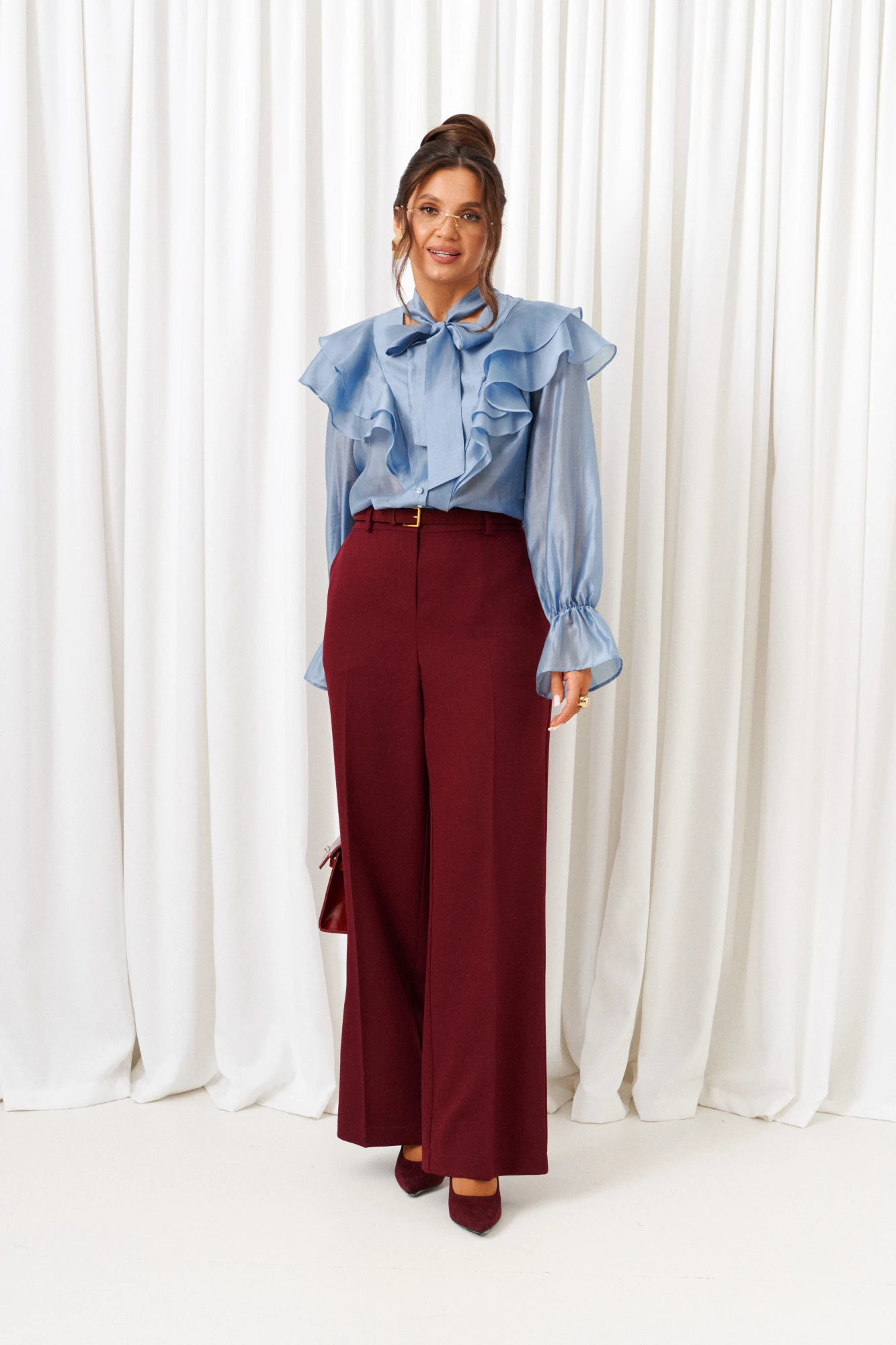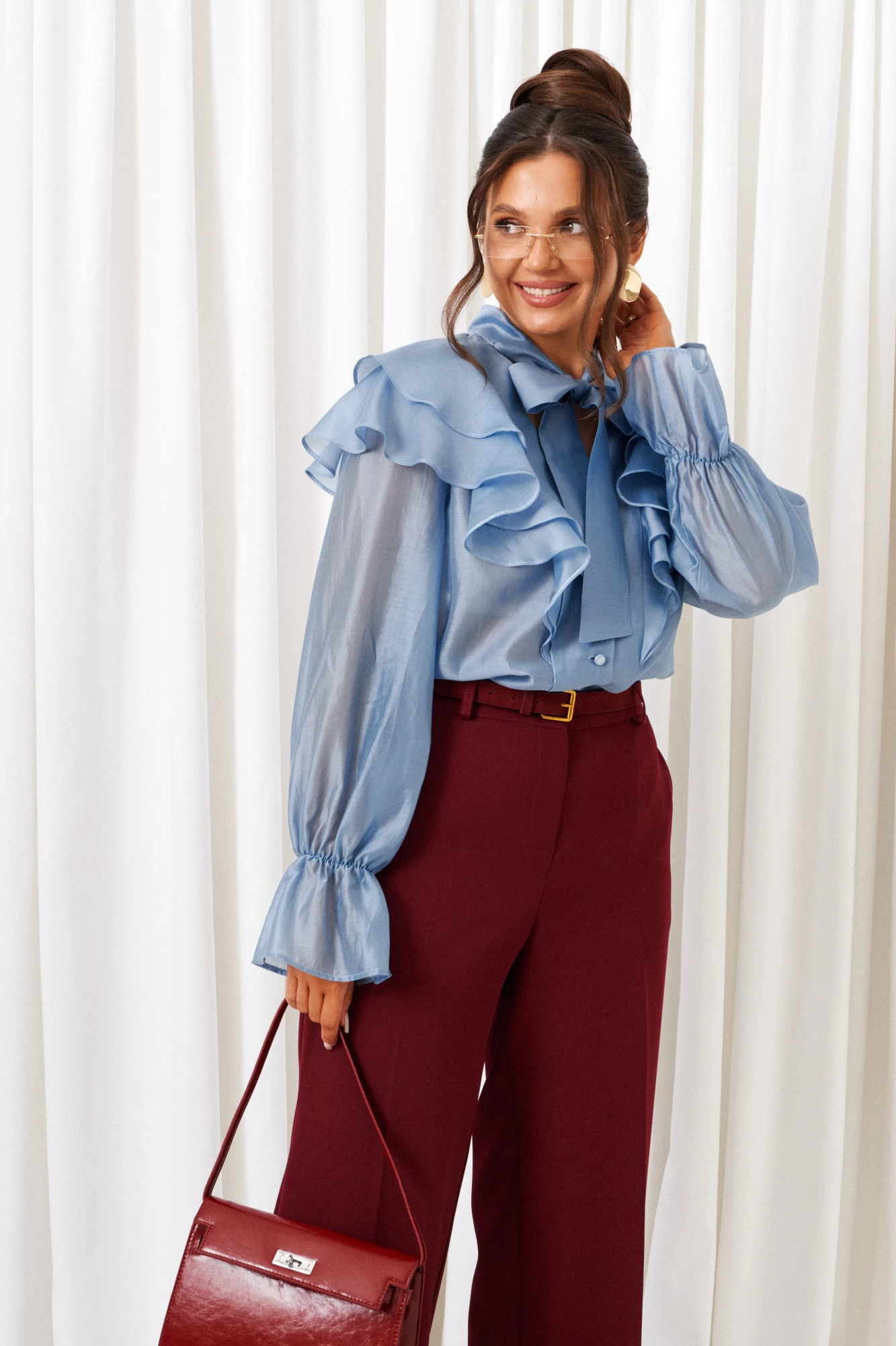 Комплект женский 2-ух предметный: блузка в романтическом стиле и классические брюки. Выполнен в комбинации изысканных костюмного и вуального полотен актуальных контрастных оттенков.