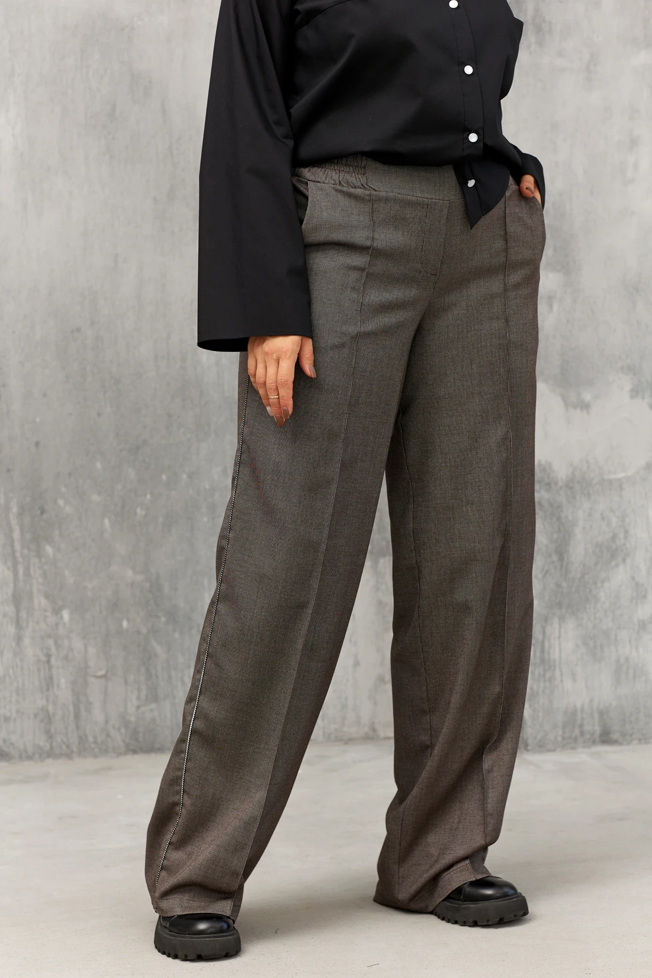 62Удобные, элегантные брюки палаццо- с высокой талией прекрасно моделируют силуэт, стройнят и визуально удлиняют ножки благодаря застроченным стрелкам и лампасу по боковому шву изделия.