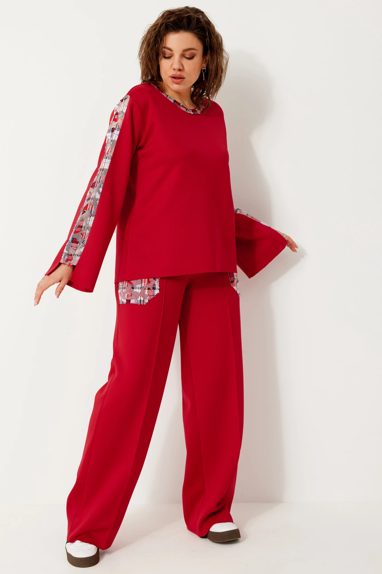 Брюки свободного кроя, с имитацией гульфика. Пояс на эластичной резинке с островком. По бокам накладные карманы из контрастного трикотажа.
