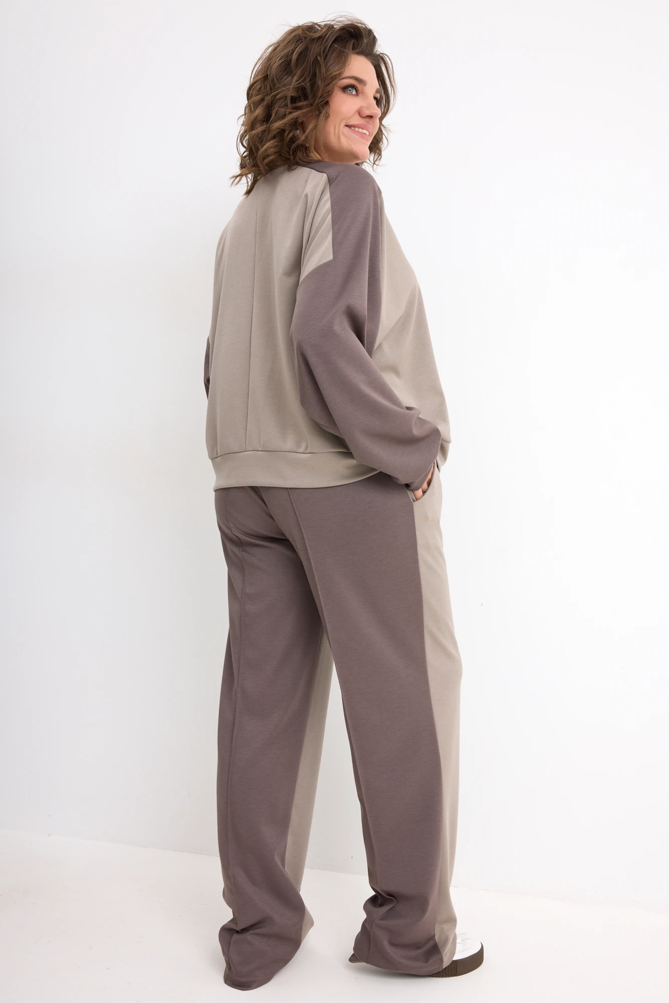 Свитшот свободного силуэта, горловина полукруглой формы обработана притачной обтачкой из основного материала, декорирована металлической брошью. Рукав реглан с манжетой по низу. Низ изделия обработан обтачкой. Брюки свободного силуэта, с застроченными стрелками. Пояс на резинке с островком для Вашего удобства. В боковых швах карманы «Хулиганы». Низ обработан классическим способом вподгибку.