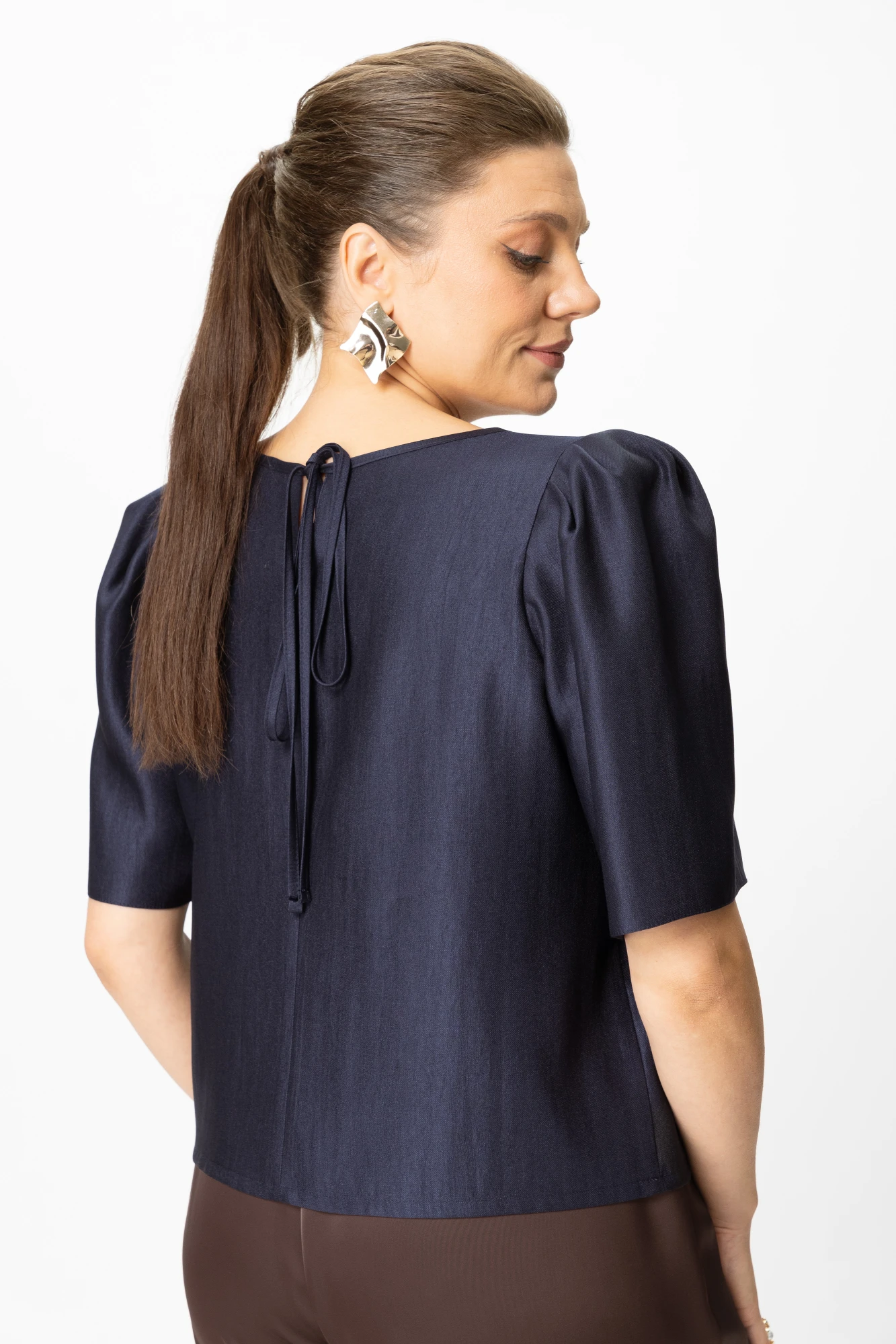 Блузка свободного силуэта из плательной ткани с блеском. Горловина круглая, по спинке в центральном шве разрез возле горловины с завязками.