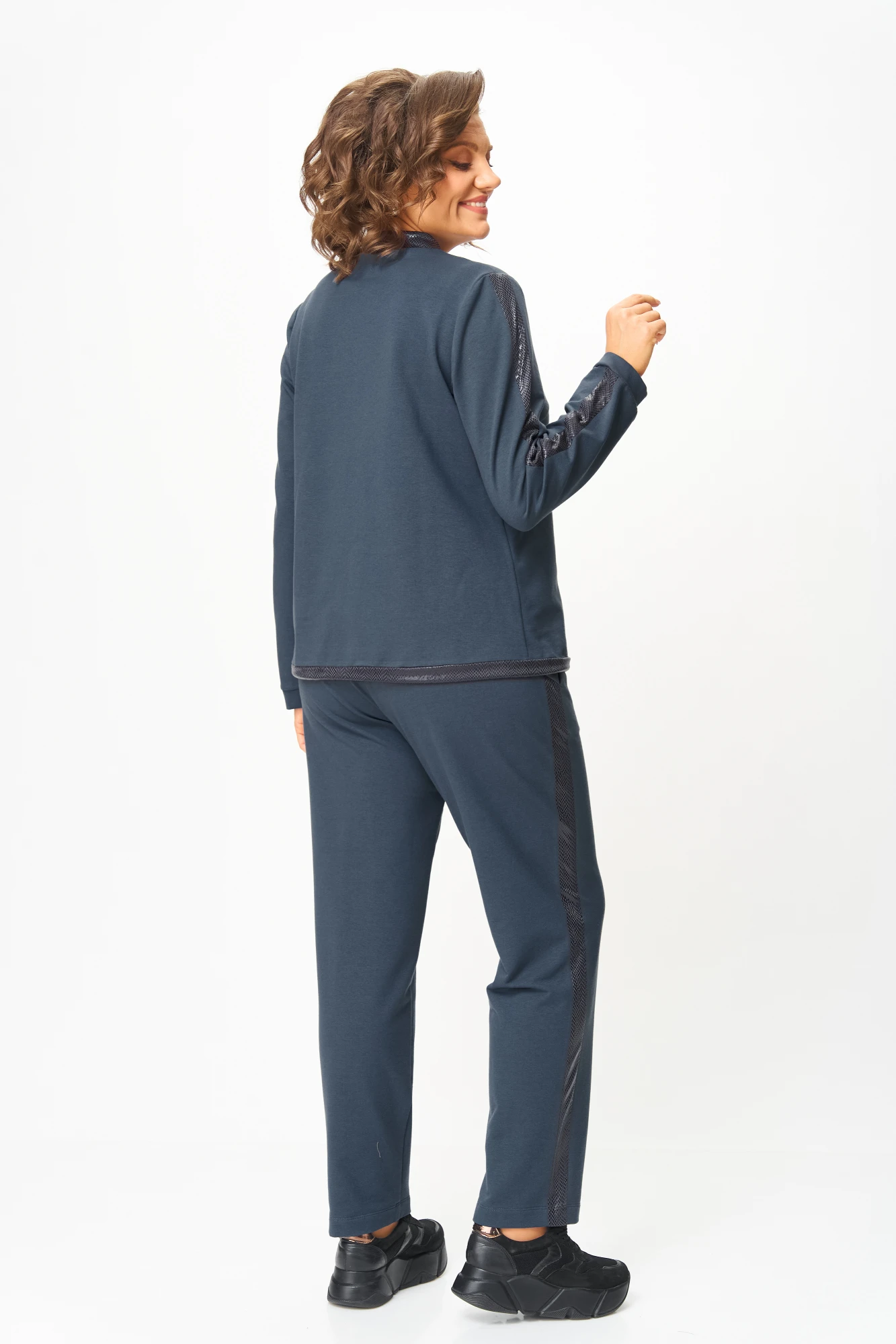Брюки, зауженные к низу, по верху на задних половинках отрезные кокетки, по боковым швам от кокетки до низа отделочные лампасы, на уровне бедер в швах функциональные карманы. Верх брюк оформлен отрезным поясом с резинкой.