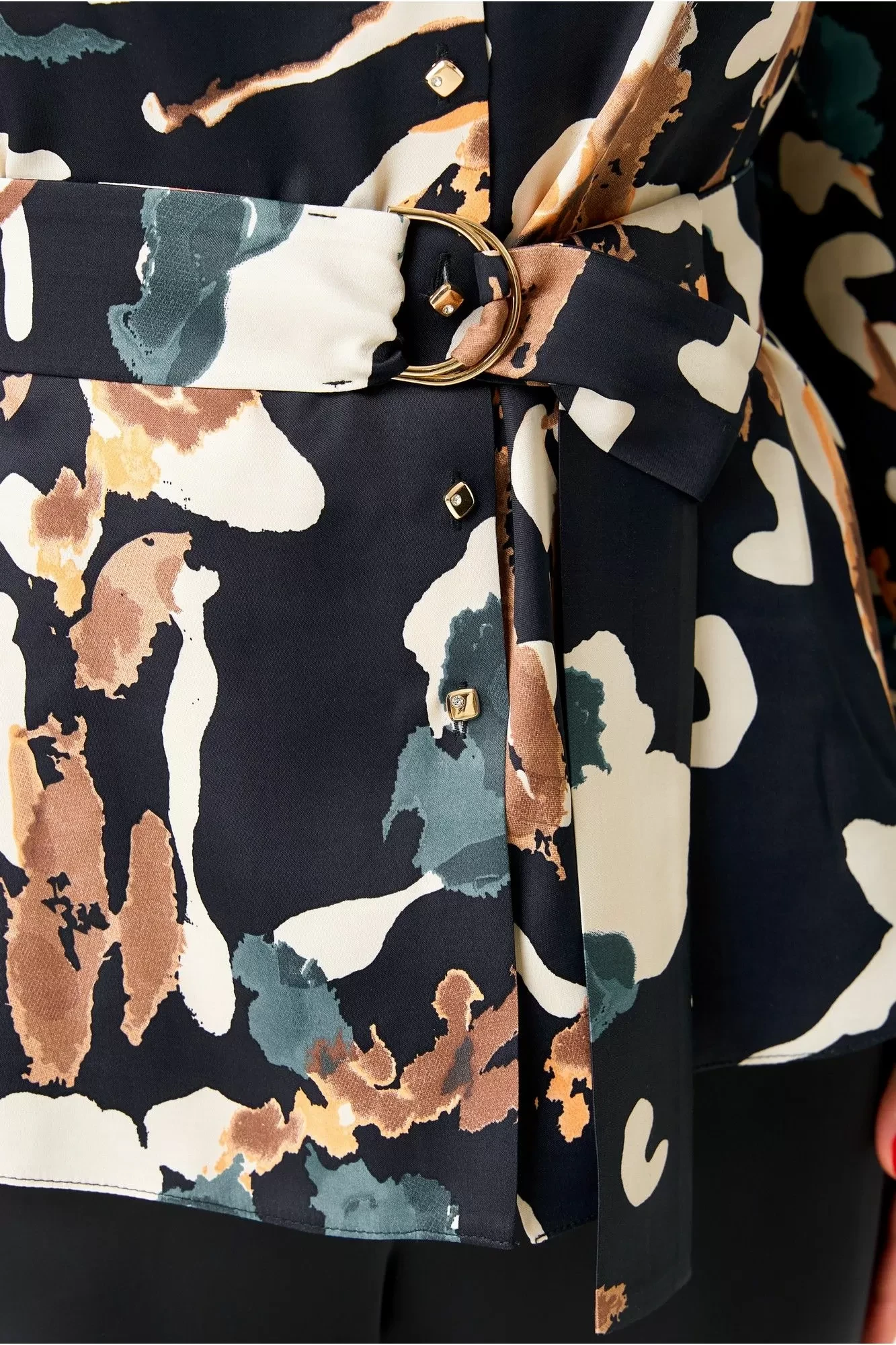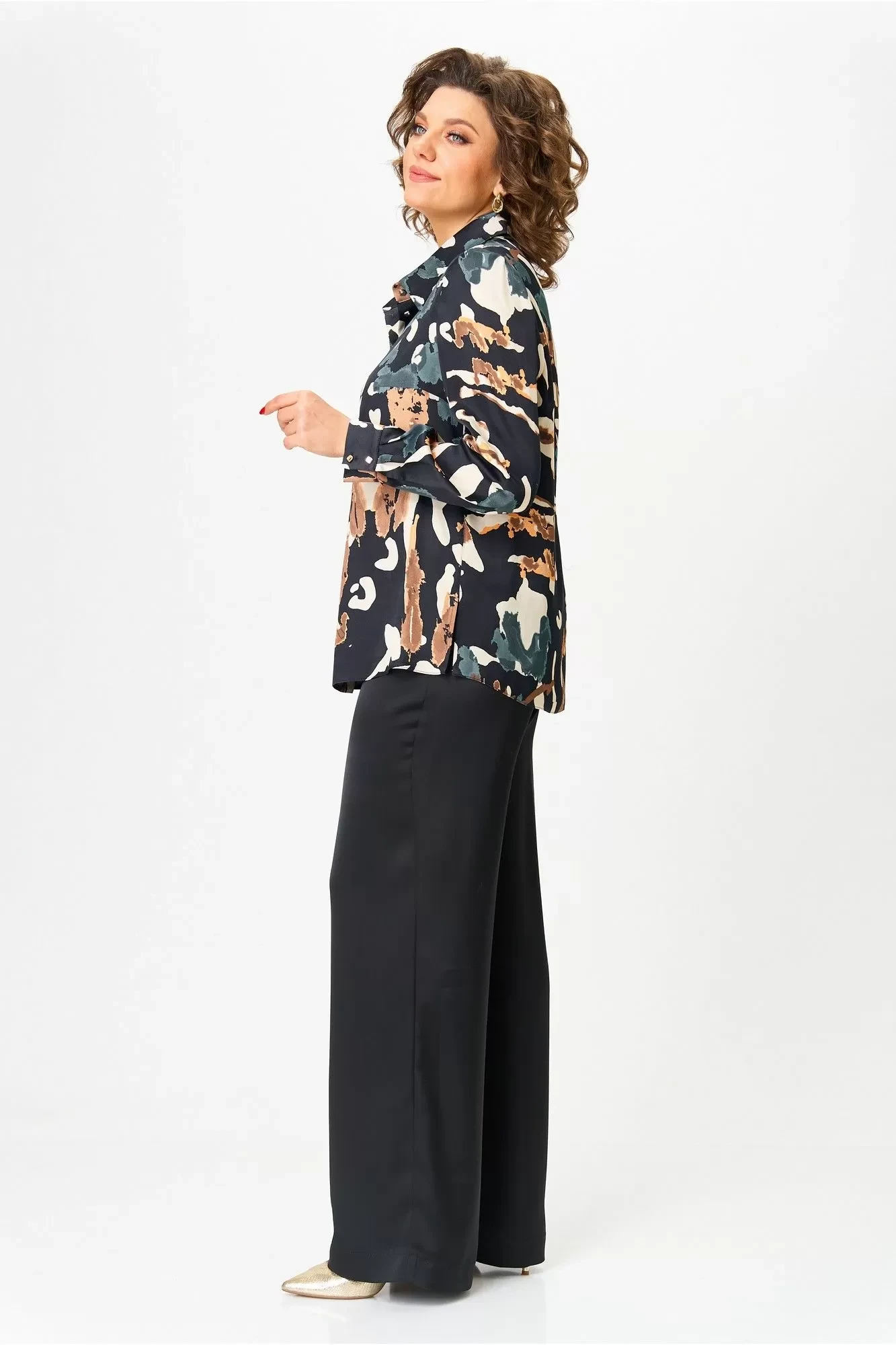 52Рубашка из атласа, полуприлегающего силуэта с центральной застежкой на декоративные пуговицы, воротник рубашечный со стойкой. Рукава втачные, по низу с манжетом, застежка на петли пуговицы.