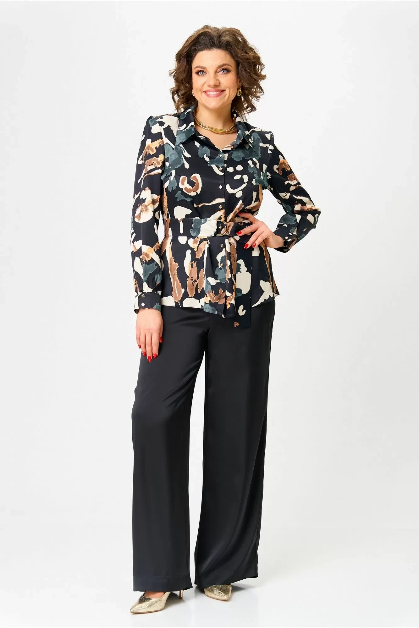 Брюки свободного силуэт, расширенные к низу, верх на поясе с резинкой. В комплект входит ремень из атласа с декоративной пряжкой.