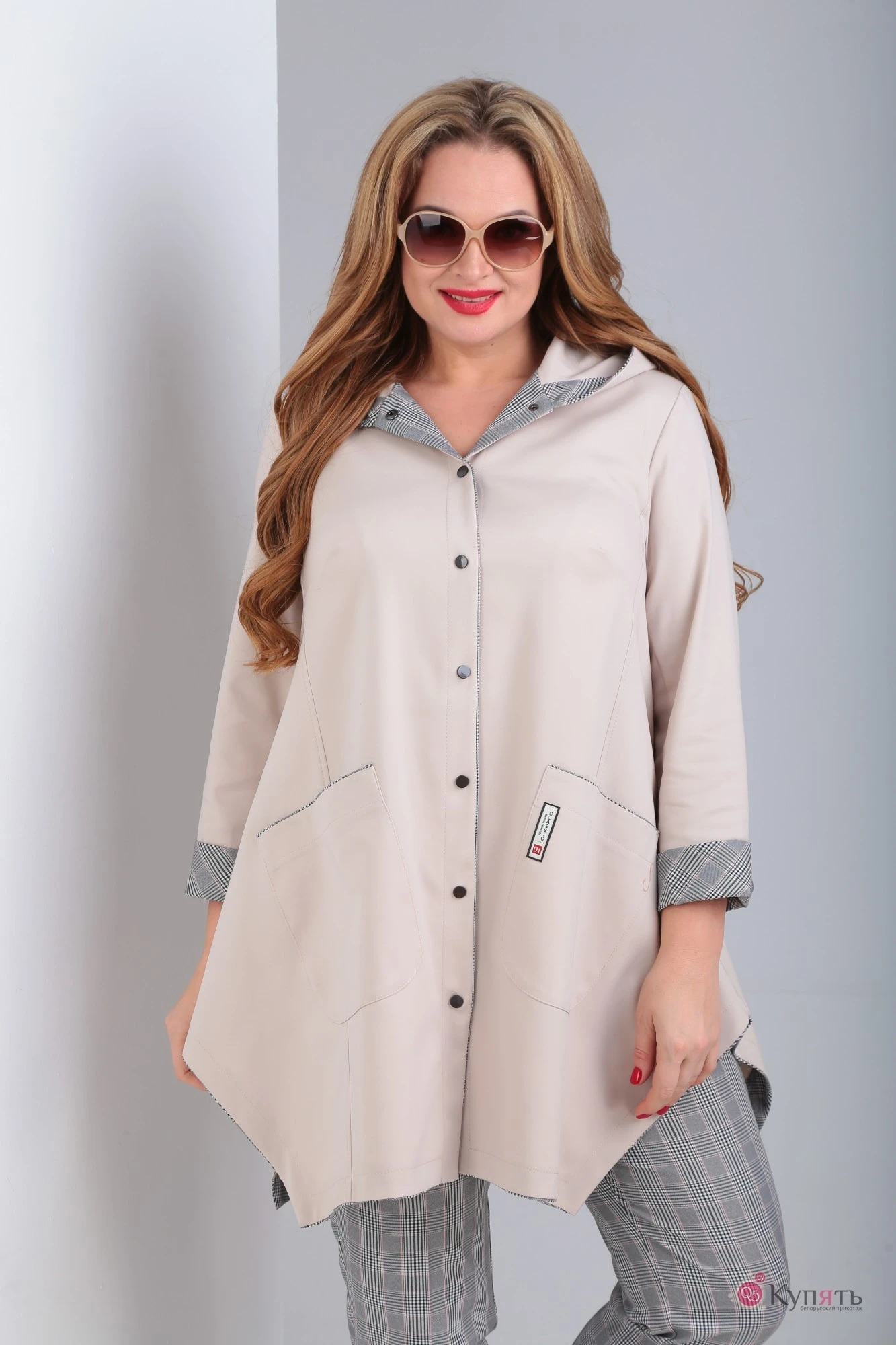 52,54,56, 58Плащ выполнен из ткани с натуральными волокнами и эластаном, центральная застежка сквозная до низа на кнопки. Полочки с рельефными линиями и нагрудными вытачками, ниже расположены наклонные накладные карманы с отделочными элементами. Горловина округлая с втачным капюшоном сзади с отделкой из ткани в клетку. По спинке центральный шов, низ фигурной формы с боковыми подрезами и обработан обтачкой из отделочной ткани в клетку. Рукав втачной двухшовный, длиной 7/8, внизу рукава отложной манжет из отделочной ткани. Брюки прямые, чуть заужены к низу, полуприлегающего силуэта с посадкой на талию, пояс притачной с частично вставленной тесьмой-резинкой, по переду- застежка на петлю-пуговицу. По переду брюк застежка гульфик на тесьму-молнию, от боковых швов выполнены наклонные внутренние карманы, внизу брюк отложные манжеты. Длина брюк до щиколотки.