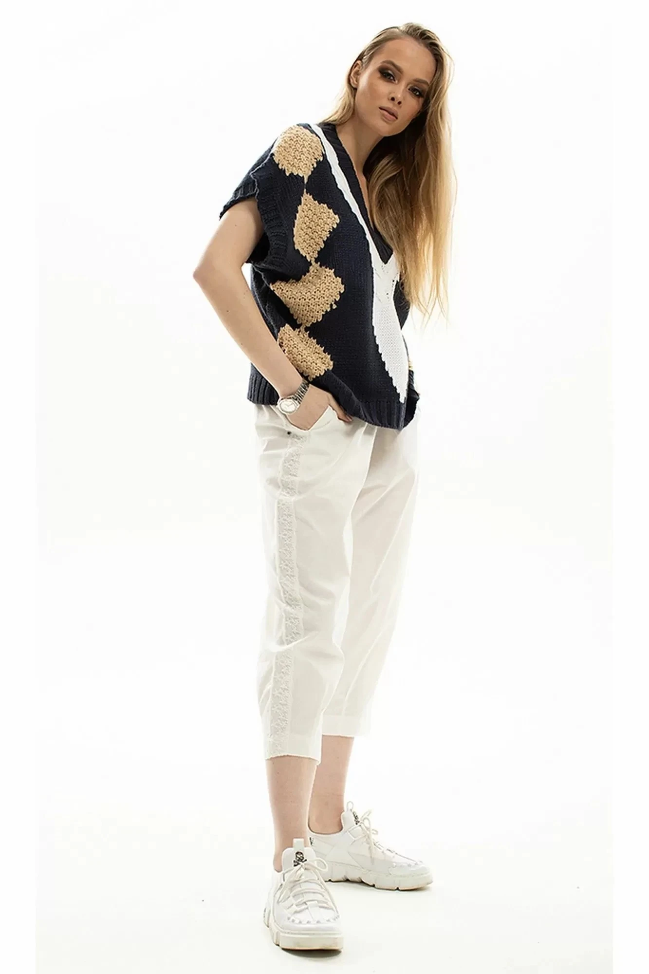 Брючный костюм Diva 1713 молочные брюки, черный жилет двойка