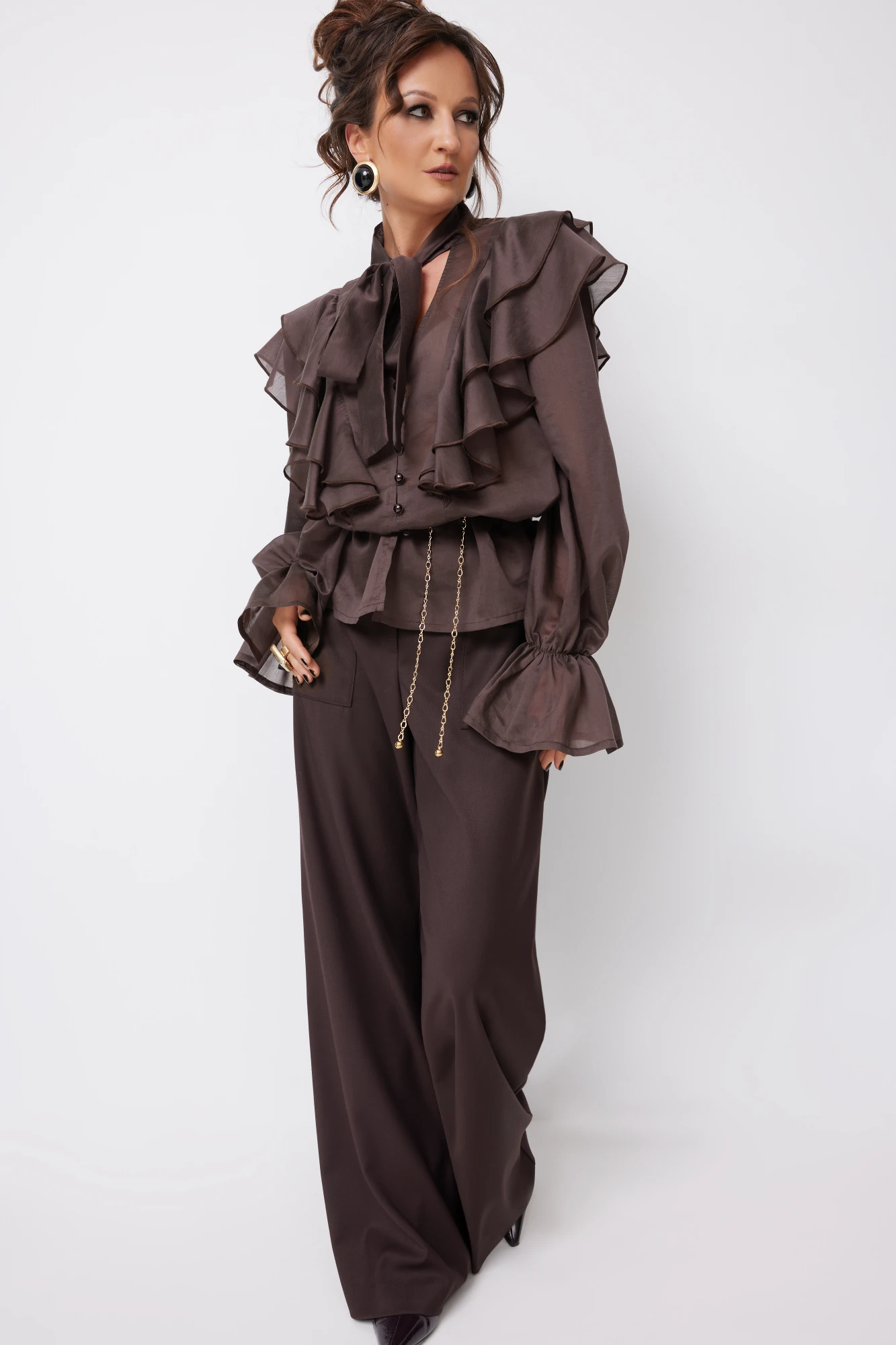 Размер 46 : Блузка ОГ-110, ОТ-126, ОБ-154, длина изделия спинки-64, ширина изделия спинки-36, ширина плеча-9, длина рукава втачного-69, ширина рукава на уровне резинки-11; Брюки : ОТ в собр.-74, ОТ в раст-84, ОБ-106, ширина изделия по низу-37 , длина изделия по боковому шву с поясом-110.