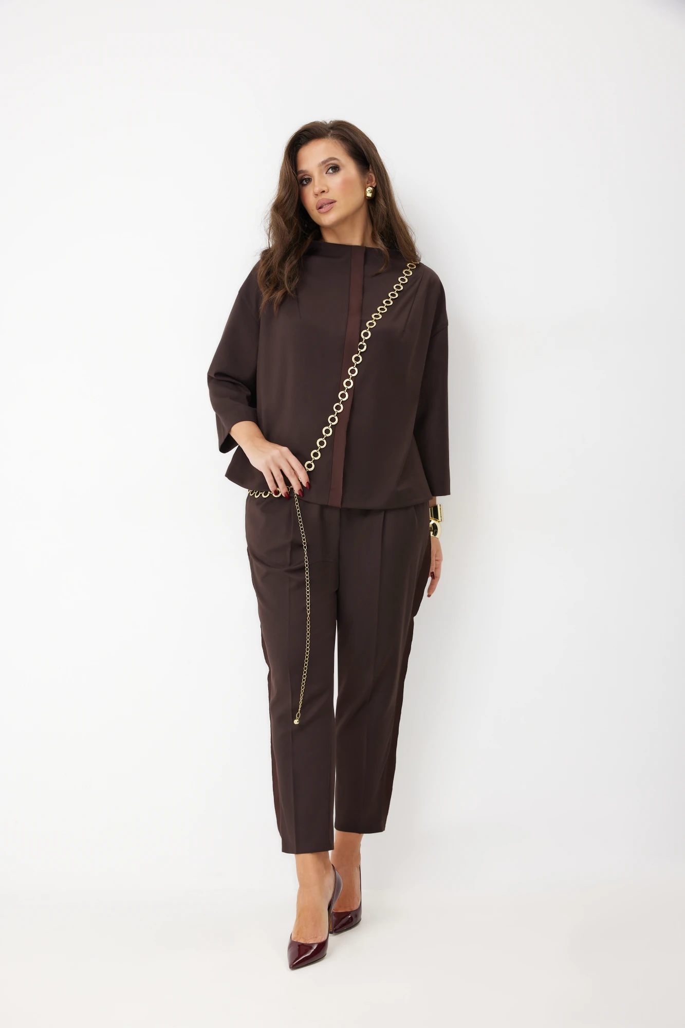 Размер 52: Блуза: ОГ-128, ОТ-128, ОБ-130, ширина плеча со стойкой-17,5, длина рукава втачного-40, ширина рукава на уровне низа-19, длина изделия спинки со стойкой-70. Брюки: ОТ в собр.-80, ОТ в раст.-100, ширина изделия по низу-18,5, длина изделия по боковому шву с поясом-101.