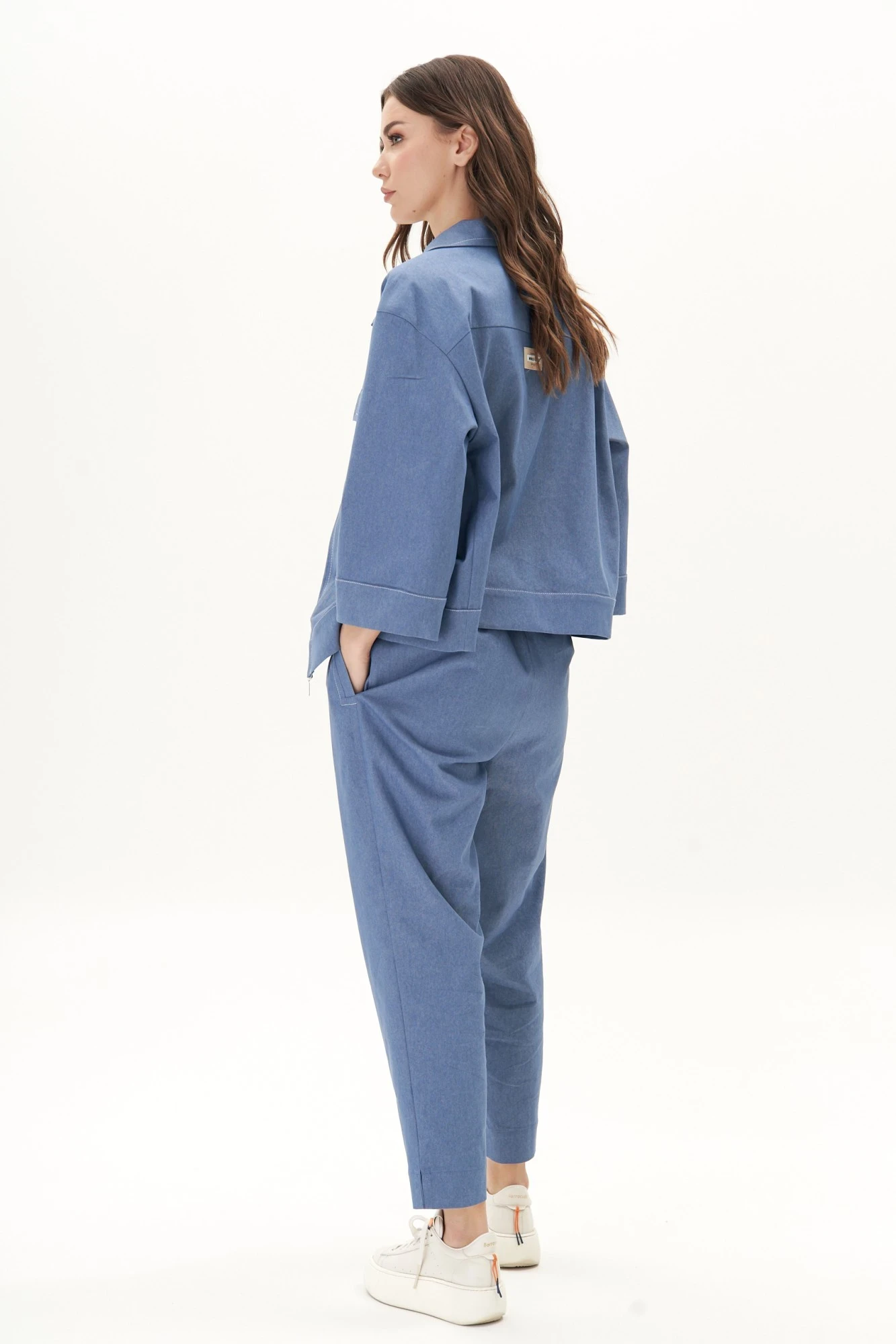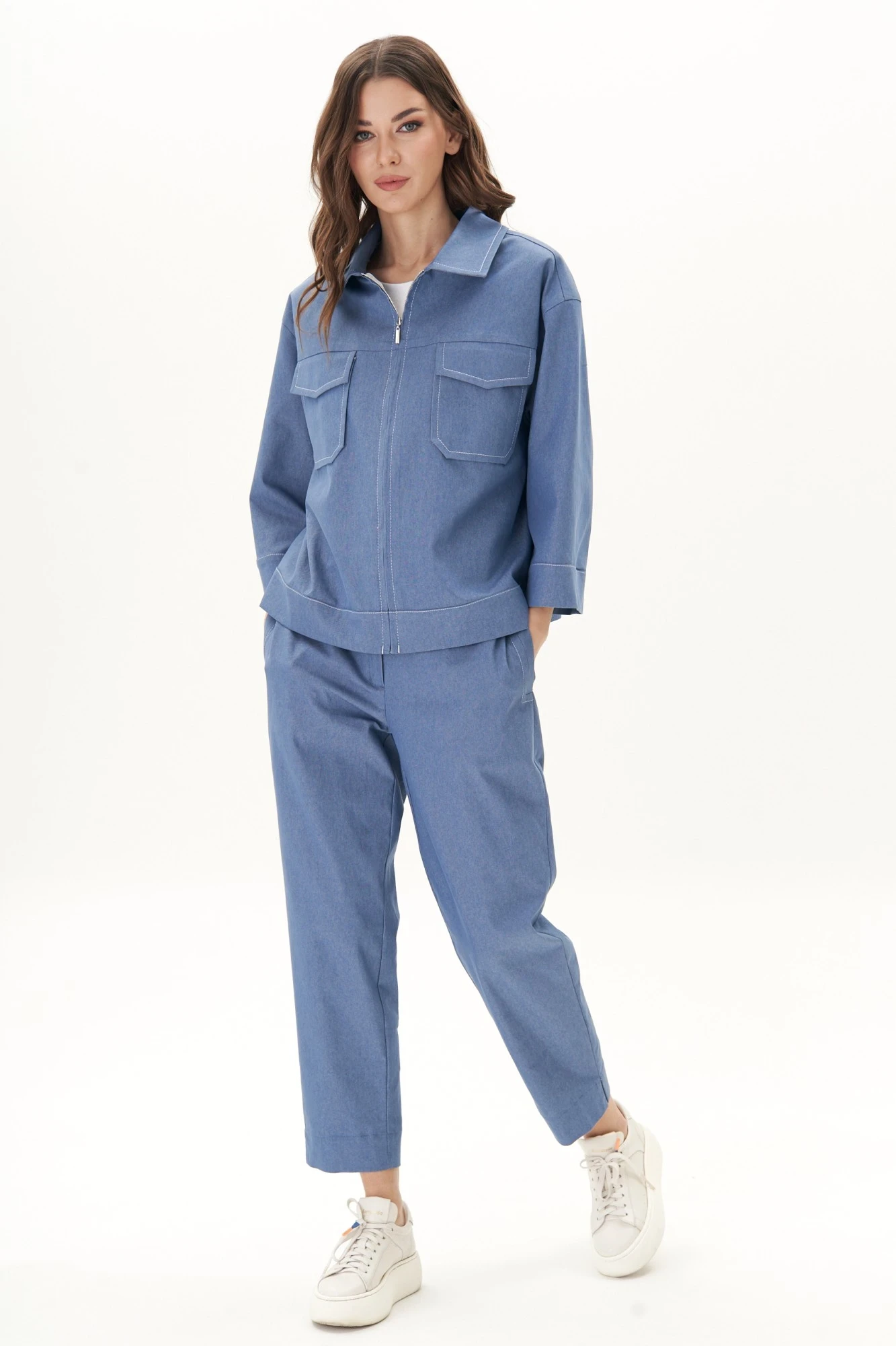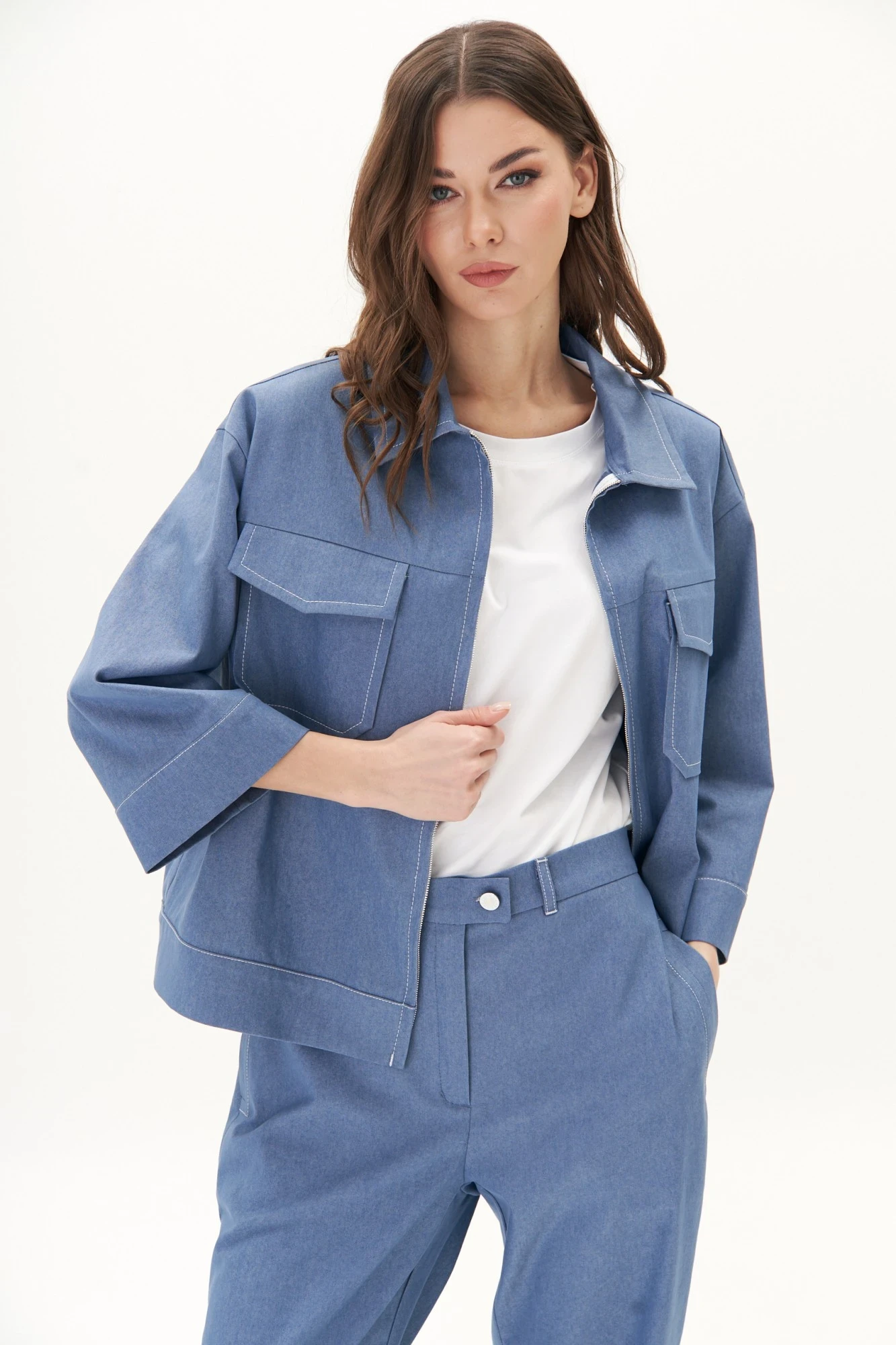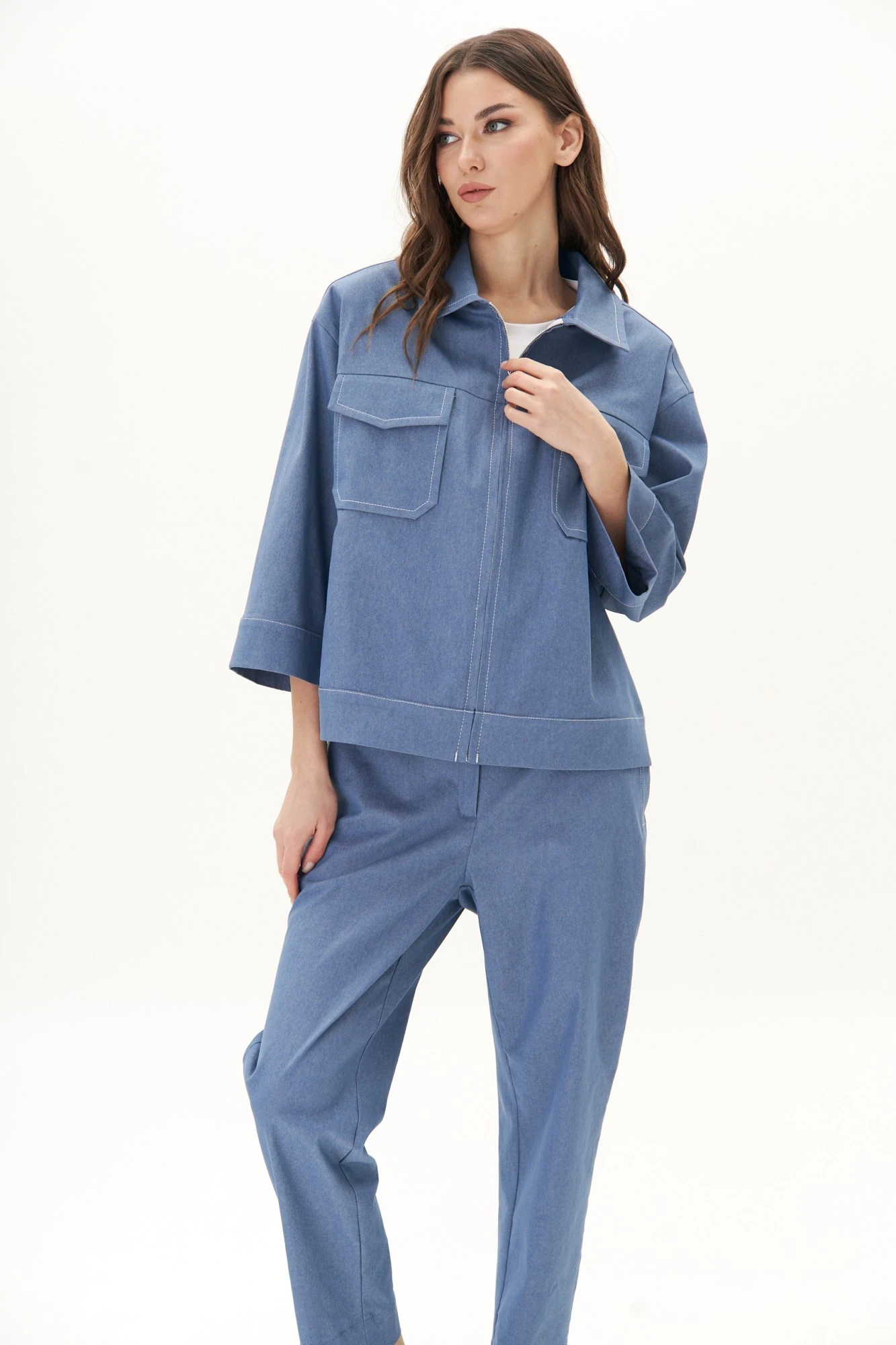 46,48,50, 52Свободный, прямлённый, слегка укороченный жакет-куртка и брюки расслабленном стиле. Куртка с центральной застёжкой, стояче-отложным воротником, рубашечного покроя, на заниженной линии плеча. Полочка с отрезными кокетками и накладными фигурными карманами с клапаном. Спинка с отрезной кокеткой. По низу изделия-приточной пояс. По низу рукава-приточной манжет.