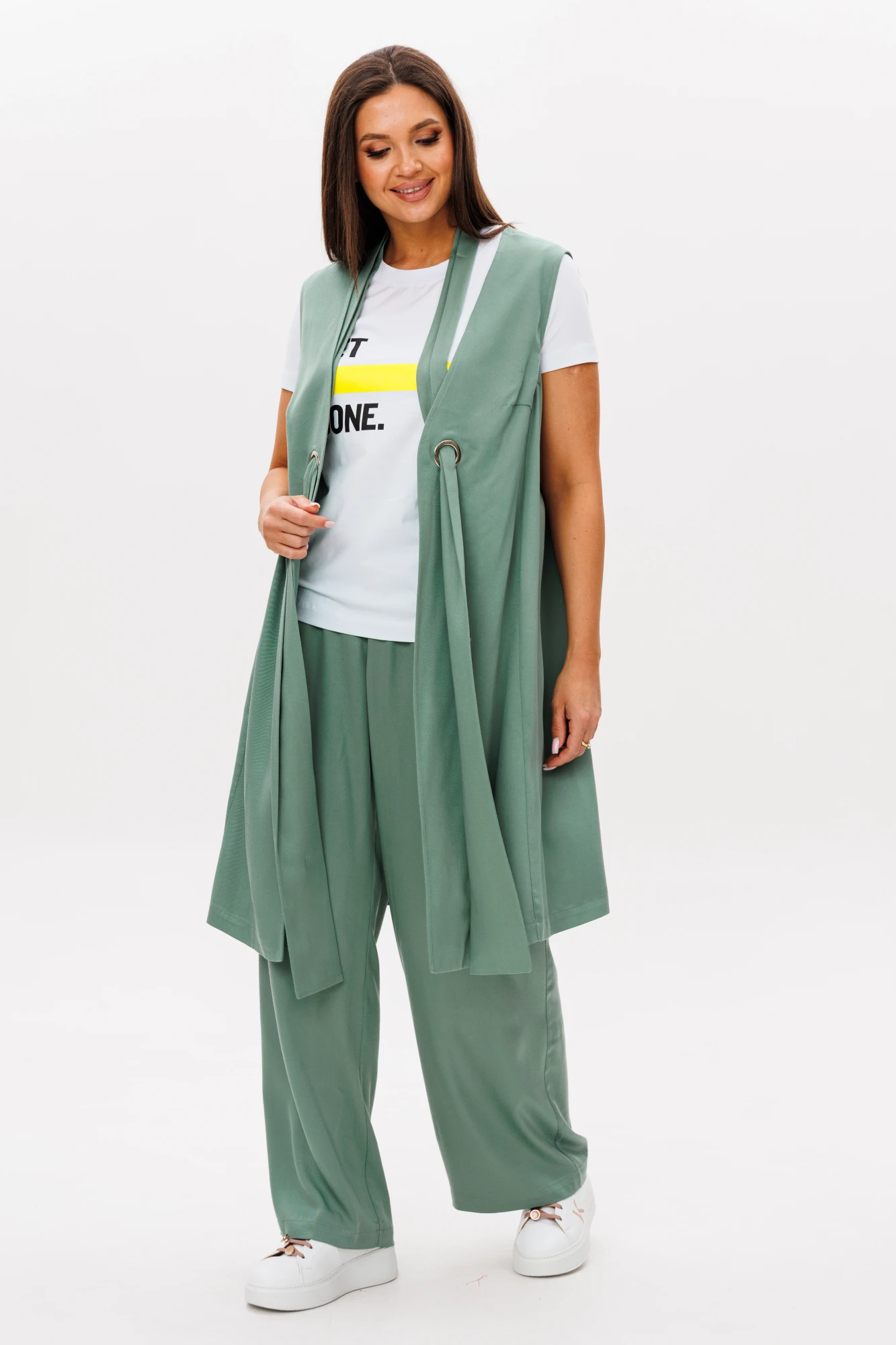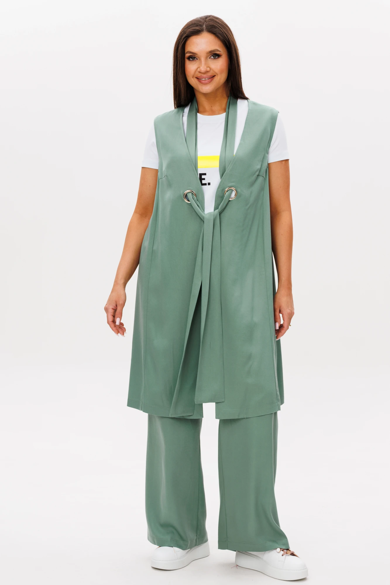 Свободный удлинённый жилет и комфортные брюки в расслабленном стиле. Жилет А-силуэта, без застёжки, с декоративными люверсами и отделочным шарфом. Полочка с боковым рельефом и нагрудной вытачкой. Спинка со средним швом и боковым рельефом.