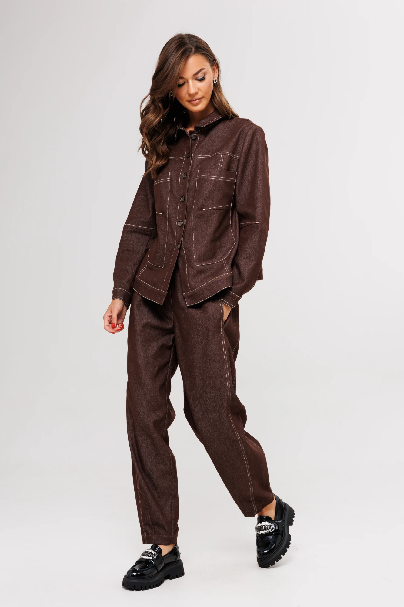 Брюки в расслабленном стиле, на притачном поясе со шлевками, эластичным в области спинки, с отрезным широким компасом по боковому шву и карманом по передним половинкам. Все швы на изделии выполнены контрастной строчкой.