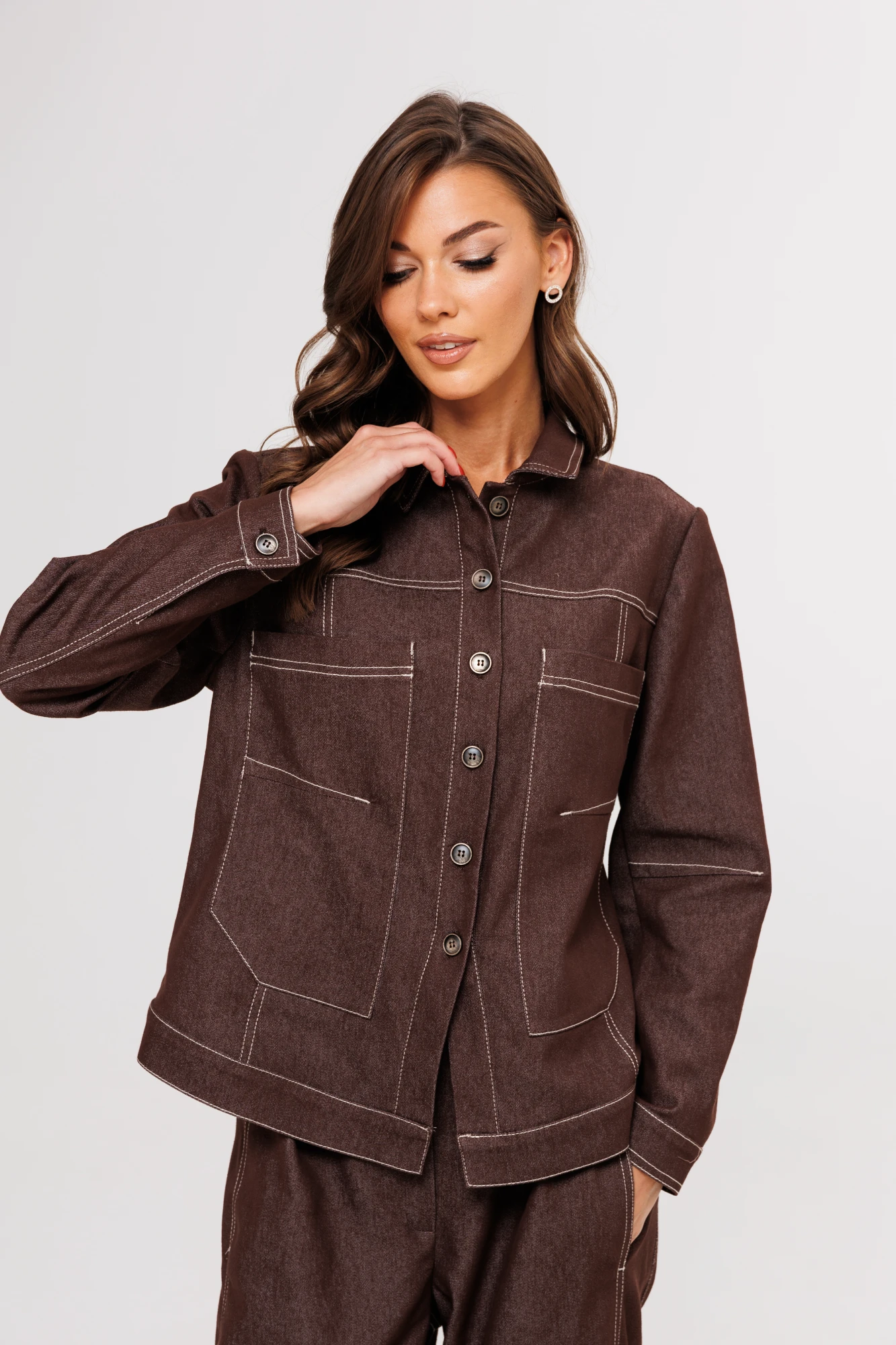 46,48,50, 52Жакет-рубашка полуприлегающего силуэта, втачного покроя с центральной фигурной застежкой на отрезной планке, втачным двухшовным рукавом на манжете и притачном поясом по низу, создающим слегка расширенную линию, имитирующую легкую баску. Полочка с отрезной кокеткой, вертикальным рельефом и фигурным накладным карманом нестандартной формы.