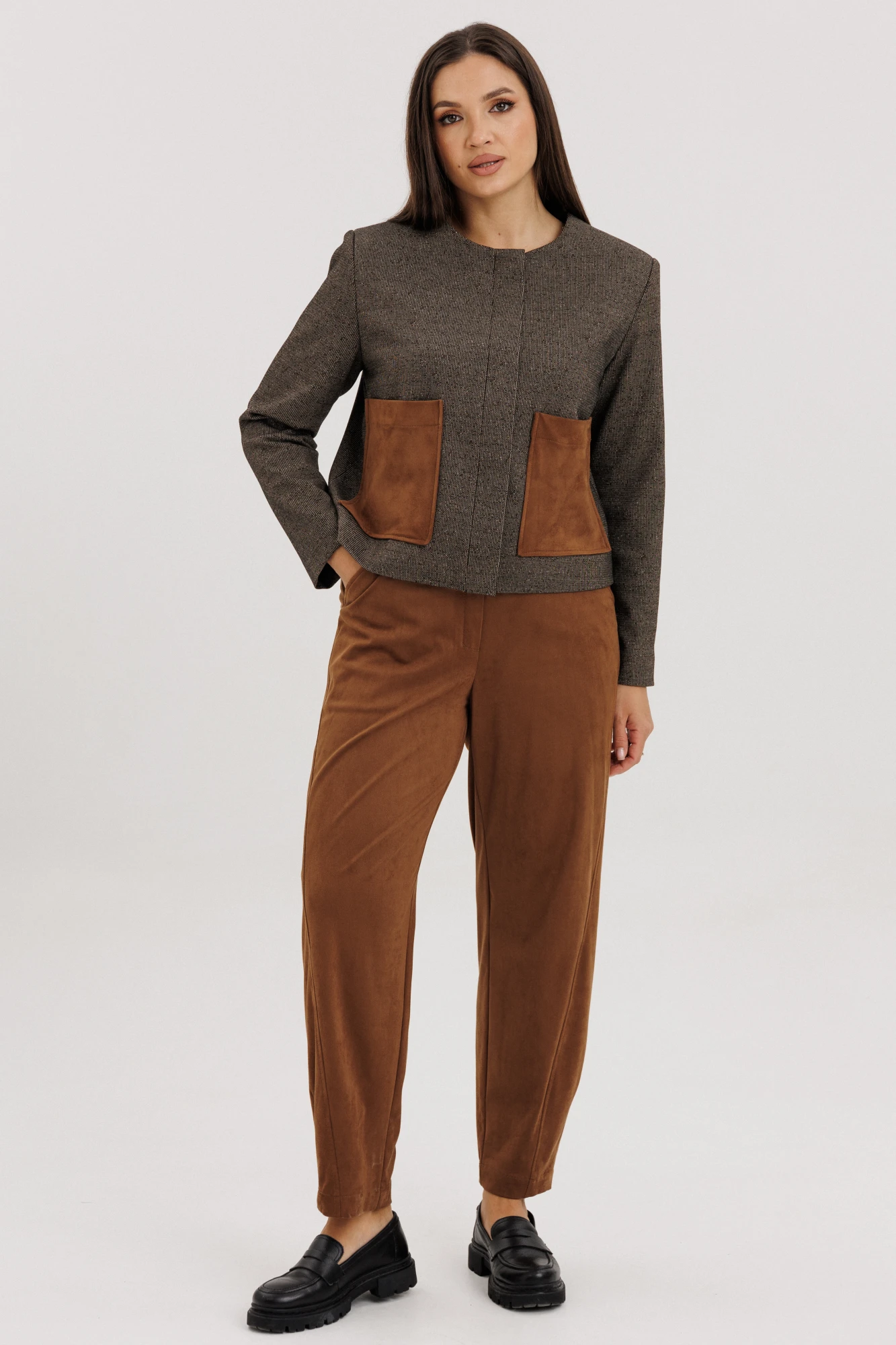Жакет прямого кроя с округлым вырезом и длинными рукавами дополнен эффектными замшевыми карманами — стильный акцент, который выделит вас из толпы.