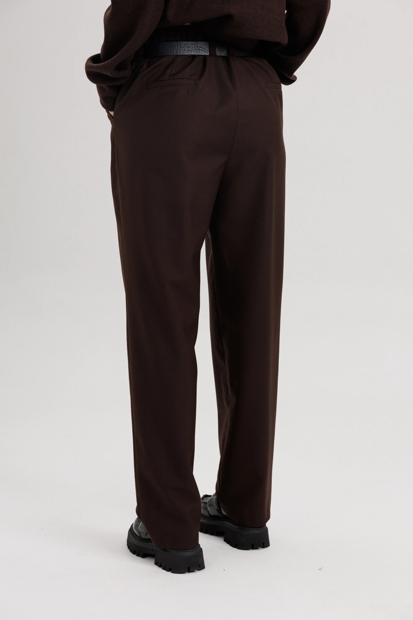 Джемпер из трикотажа. Это одна из базовых вещей осенне-зимнего сезона. Он тёплый, удобный и невероятно комфортный. К тому же, настолько универсален, что его можно стилизовать абсолютно разными способами. Свободный покрой с заниженной линией плеча, рукав рубашечного покроя на отрезной манжете, воротник классический, по центру полочки частичная застёжка-молния. По низу джемпера - отрезной пояс. Брюки классические, прямые, на отрезном поясе со шлевками, эластичном в области спинки. Передние половинки брюк с талиевыми вытачками и наклонными боковыми карманами.