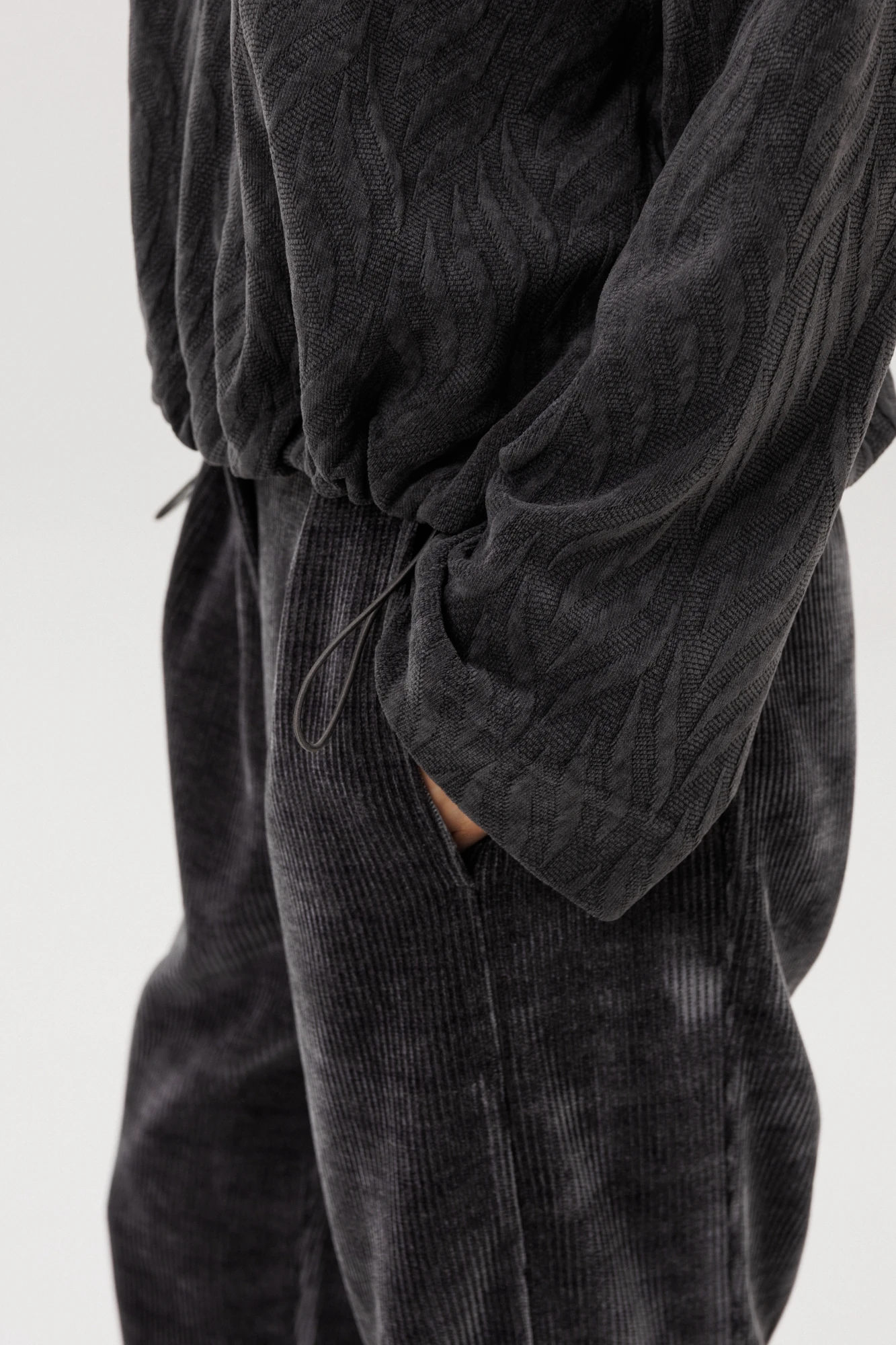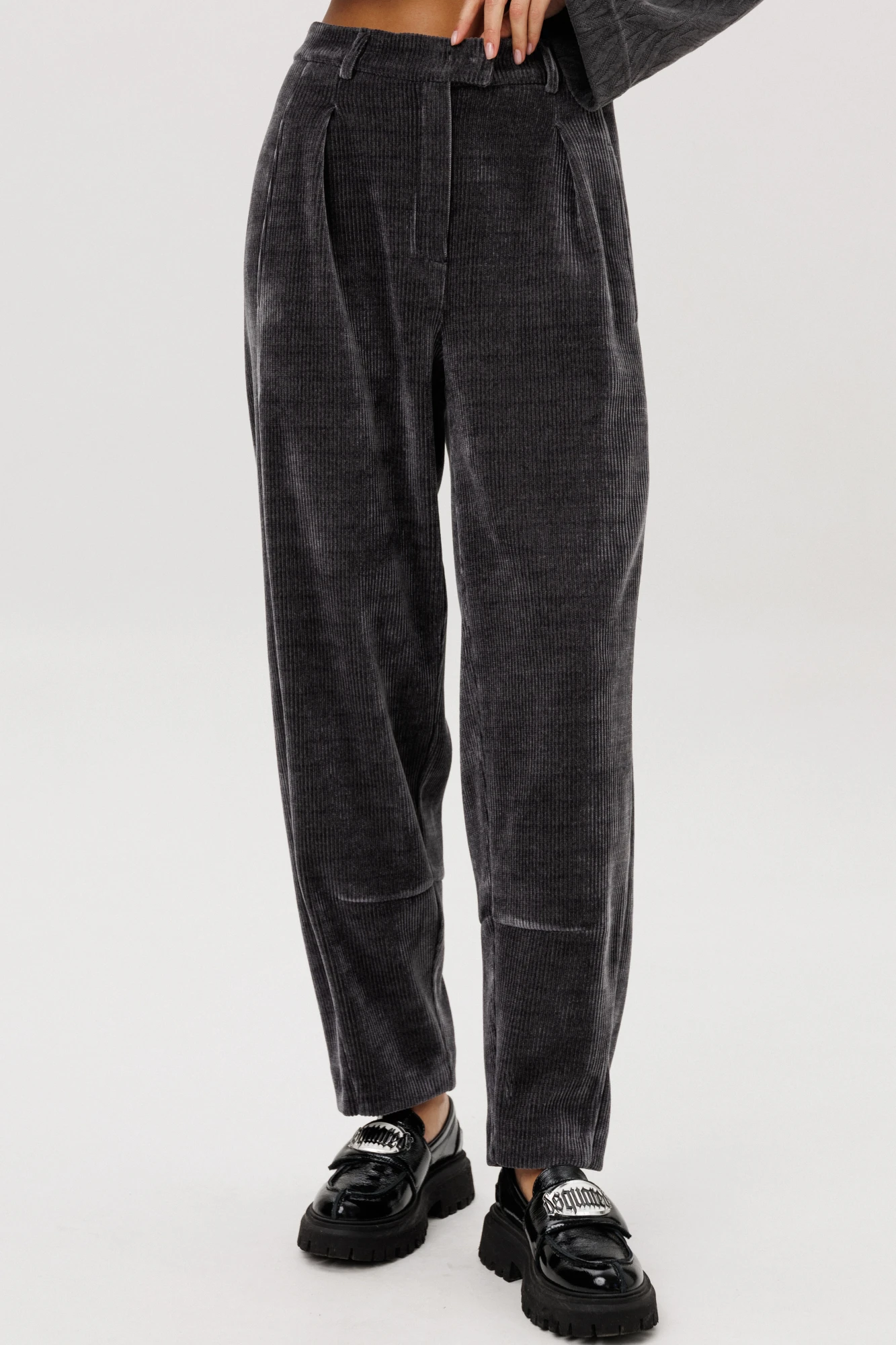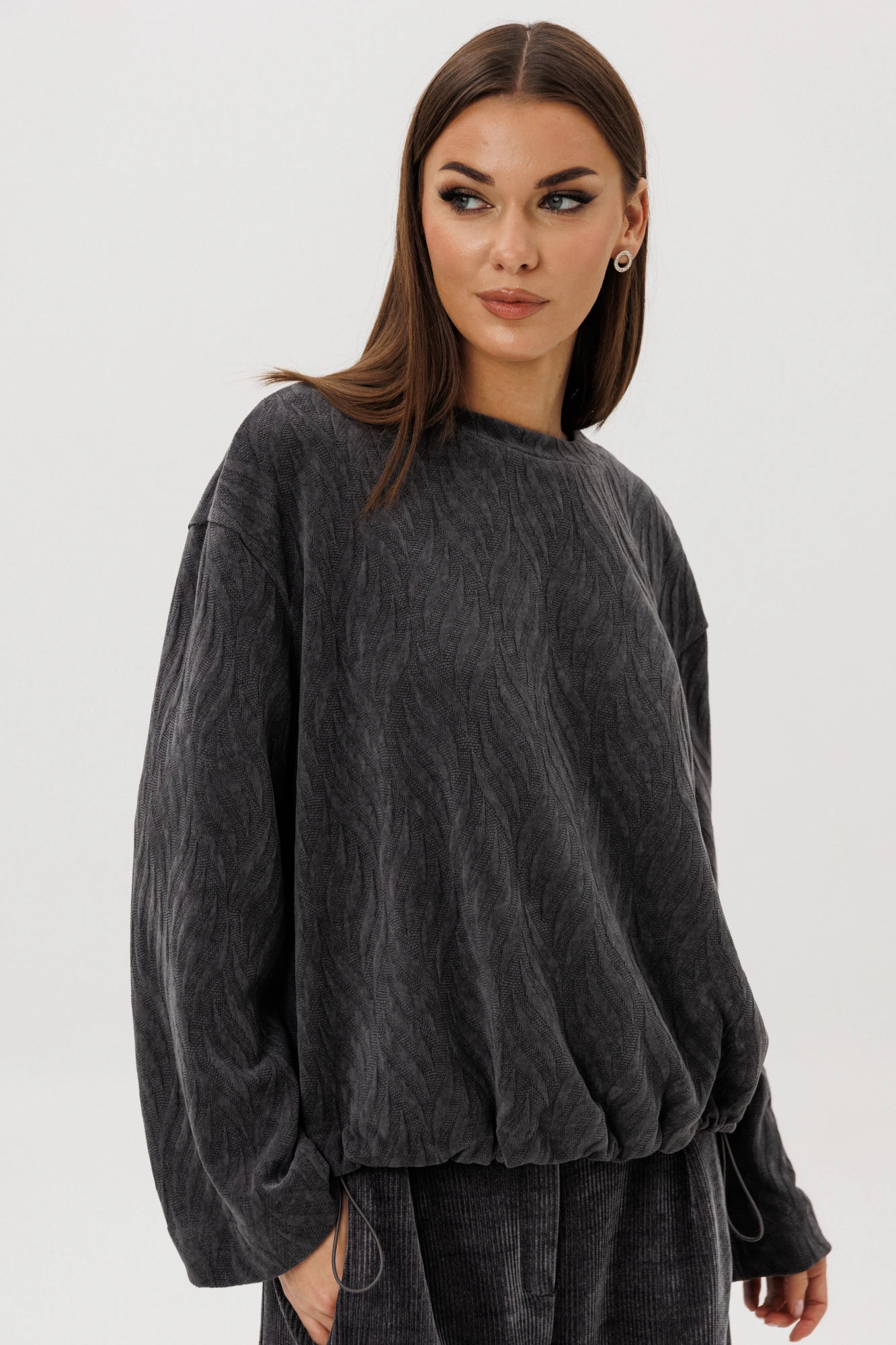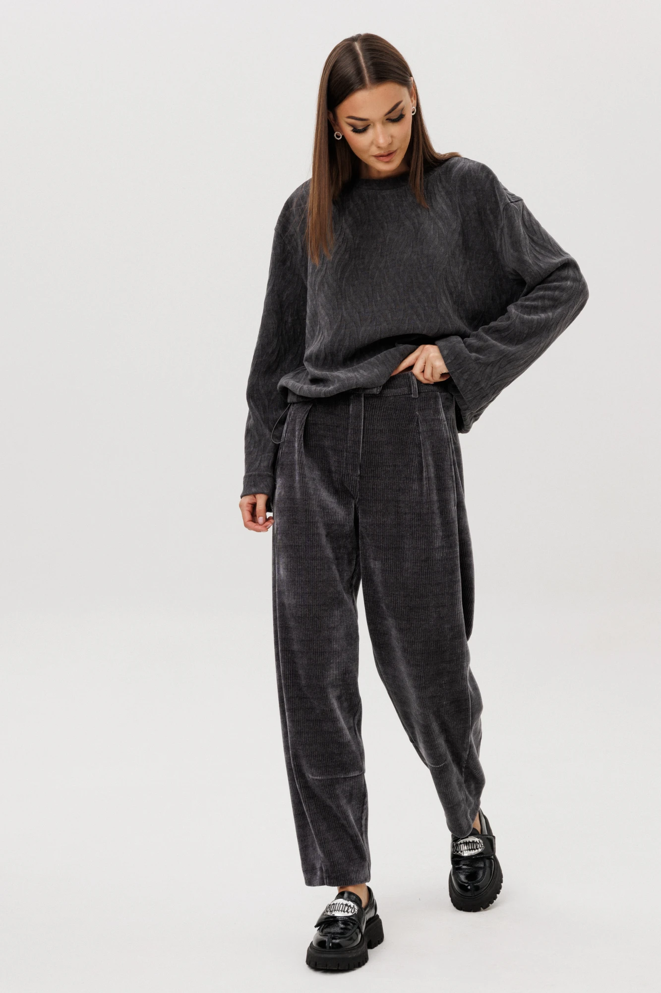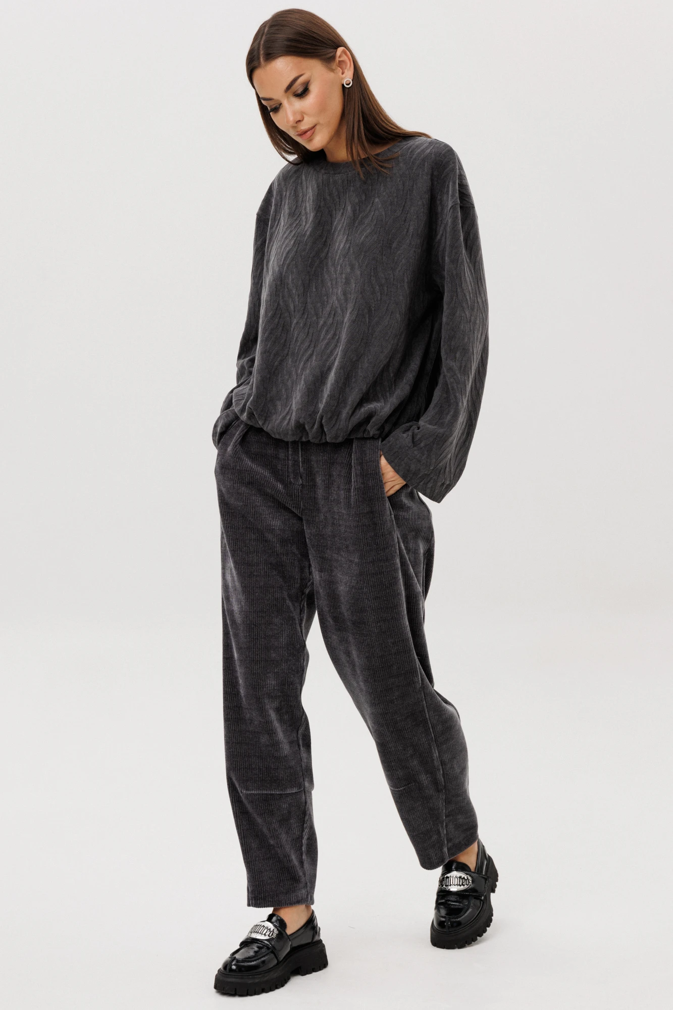 Свободный джемпер расширенного силуэта втачного покроя на заниженной линии плеча. Рукав расширенный в области оката. По низу джемпера шнур- резинка с фиксаторами. Брюки """"баррел"""" на притачном поясе со шлёвками (эластичном в области спинки), с наклонными карманами , мягкими складками защипами по верху брюк.