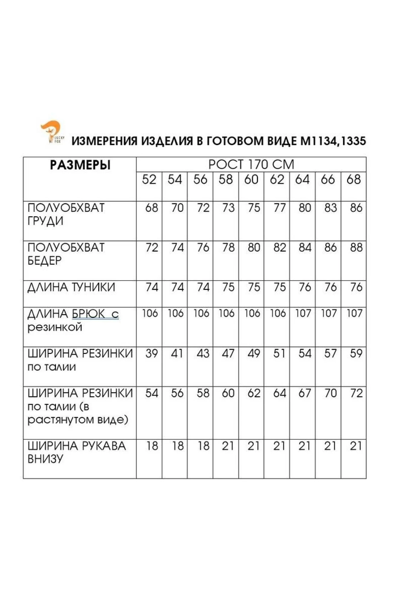 52,54,56, 58 , 60 , 62 , 64 ,66,68,7052р: Длина брюк по боковому шву - 106 см Ширина резинки - 4 см. ОБ - 120 см. ОТ 80-100 см. Длина туника - 73 см. ОГ 146 см. Ширина рукава внизу 34 см.