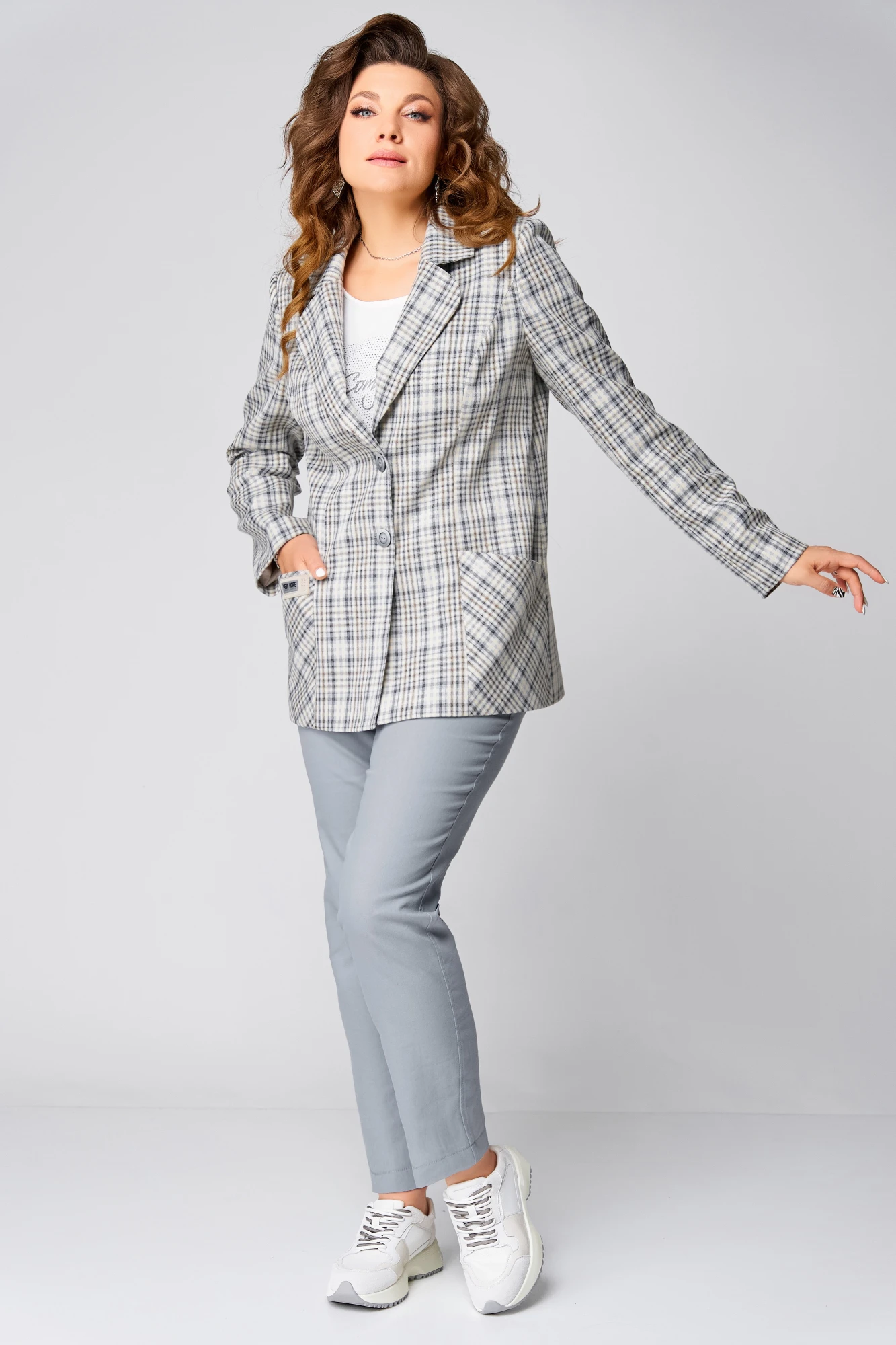 Блузка из лёгкой текстильной ткани с жатым эффектом — настоящий акцент ансамбля. Она дарит образу воздушность и романтичную нотку. Нагрудная вытачка подчёркивает форму, а декоративная печать на полочке превращает её в арт-элемент. Обработка пройм и горловины обтачкой говорит о внимании к деталям и безупречном исполнении.