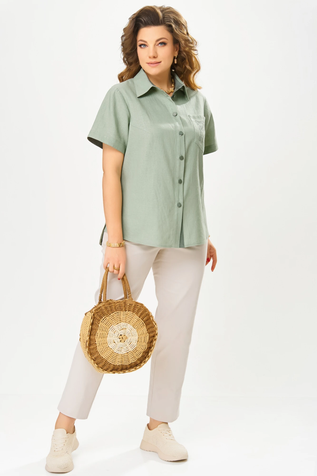 Блузка из льняной ткани с вискозой отличается легкостью и приятной текстурой, обеспечивая ощущение свободы и свежести. Ее прямой силуэт подчеркивает естественные линии фигуры, а однобортная застежка с отрезной планкой на пуговицах добавляет классический штрих. Воротник-стойка рубашечного типа придает аккуратность и изысканность, а нагрудная выточка обеспечивает идеальную посадку.