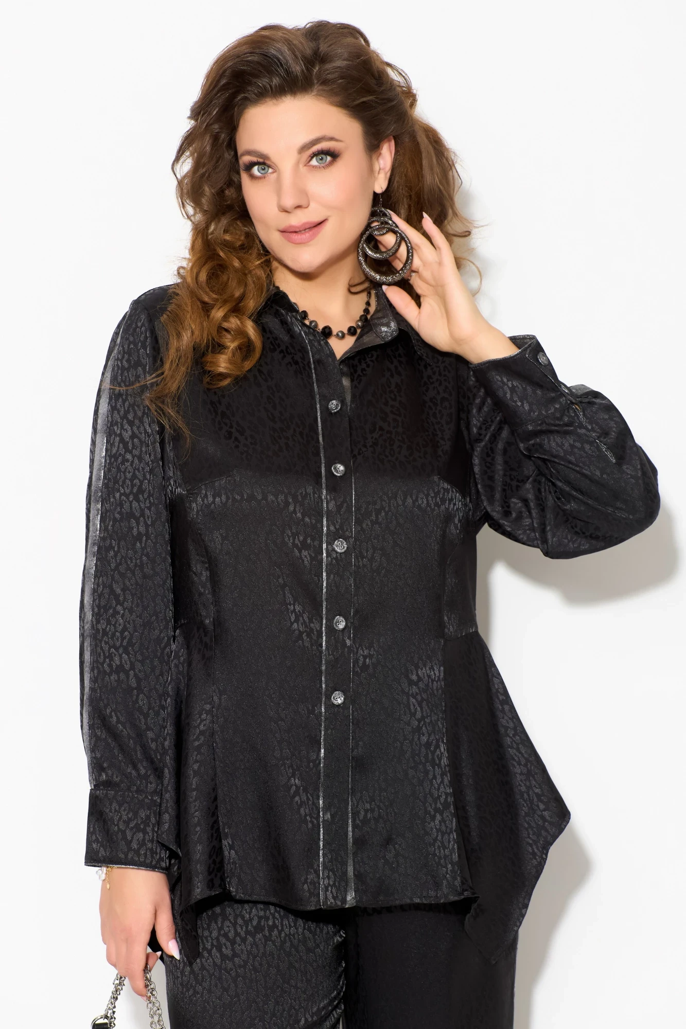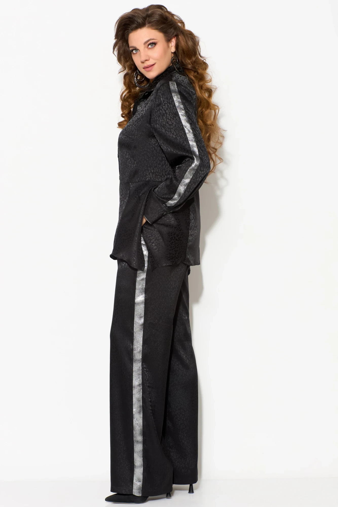 Брюки выполнены из текстильной леопардовой сатиновой ткани. Брюки прямые на резинке. В боковых швах брюки карманы, в брюках вставлены лампасы из отделочной ткани. Низ брюк обаботаны швом в подгибку швом с закрытым срезом.