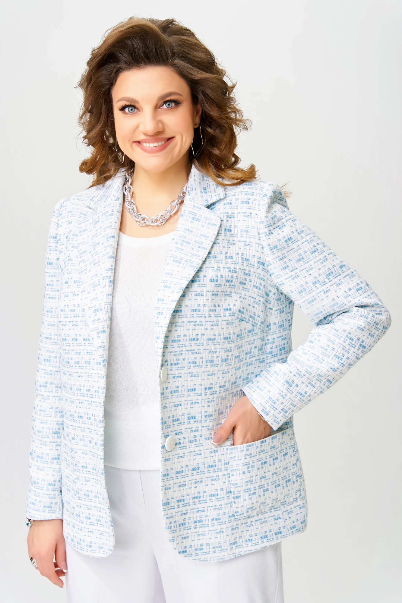 Жакет выполнен из хлопковой плотной ткани, рисунок в виде плетеной корзинки. Жакет на подкладке полуприлегающего силуэта, воротник отложной, по борту лацканы, низ борта закругленный, застежка однобортная на две пуговицы. По полочке - рельеф и накладной карман. По спинке - рельефы, рукав втачной двухшовный. Жакет нарядный отличный вариант для праздников и повседневной носки.