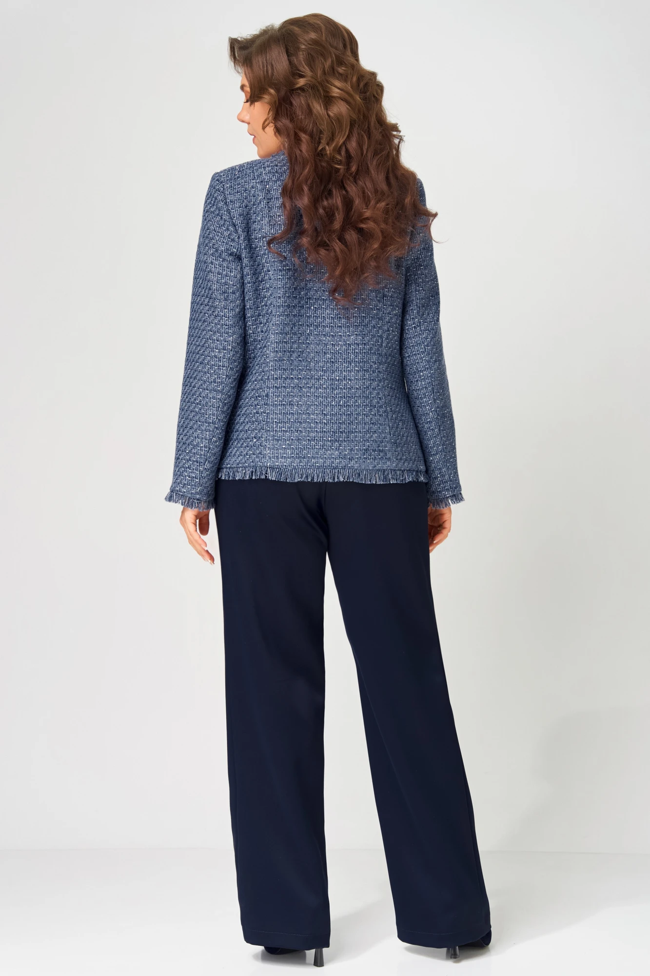 Жакет выполнен из твидовой ткани на подкладке полуприлегающего силуэта. Застежка в жакете однобортная на пуговицу, по полочке - рельефы, карман-обманка в виде настроченной трепки, по спинке рельефы. По краю борта и низа жакета вставлена трепка, рукав втачной двухшовный, по низу рукава вставлена трепка.