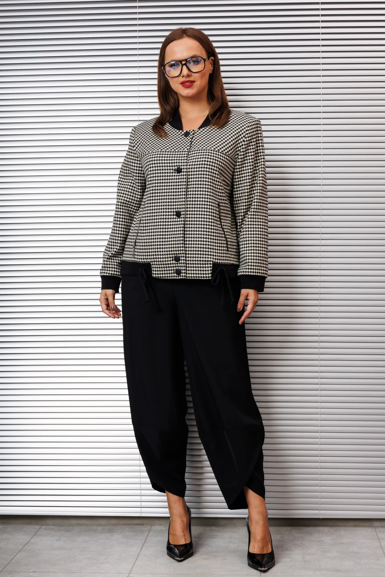 Бомбер свободного силуэта, вырез горловины округлый с довязом, рукав втачной на манжете из резинки по низу. По переду бомбера кокетка и карманы на молнии. Застежка на петли и пуговицы. Бомбер на подкладке.