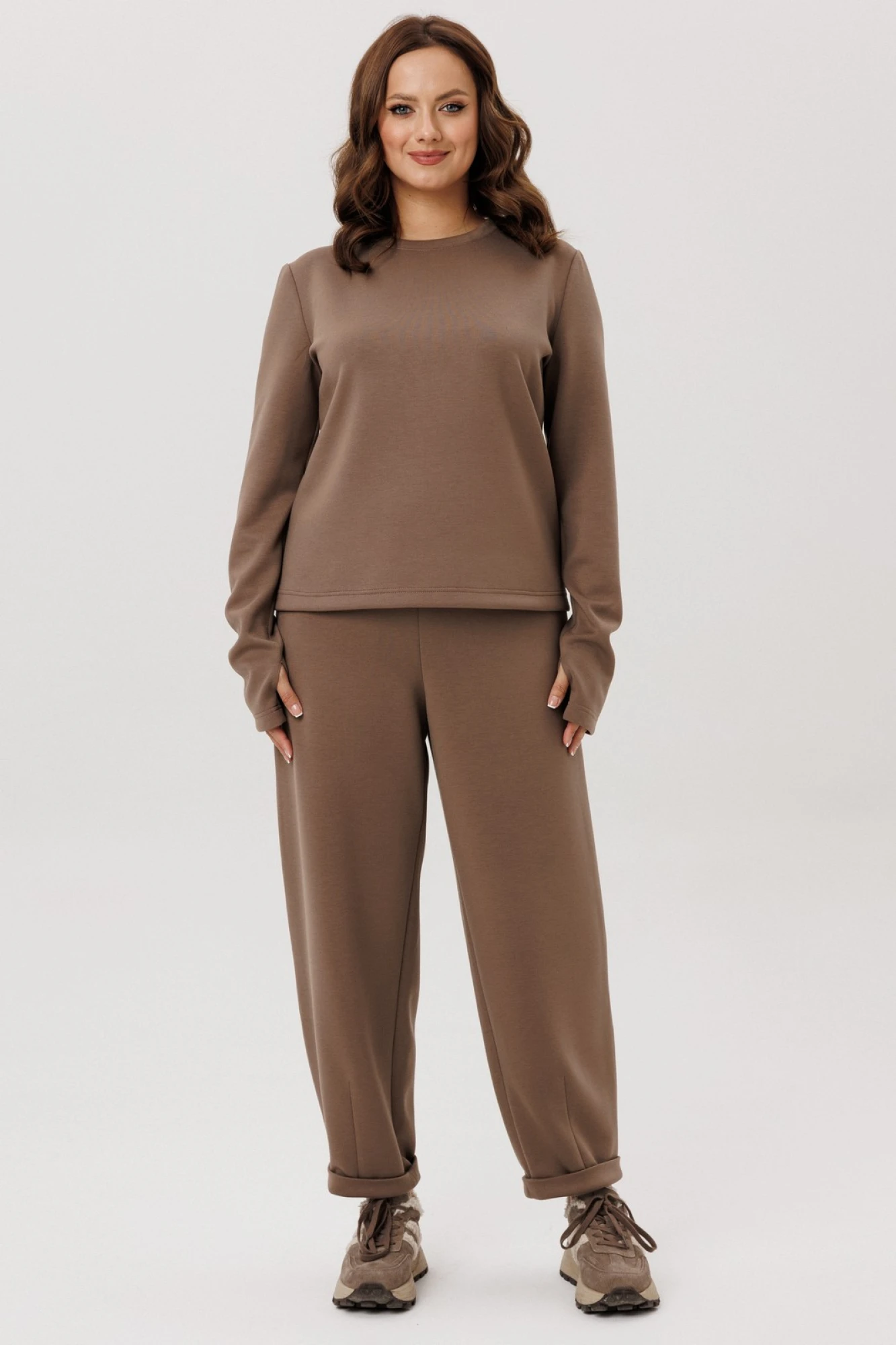 Джемпер свободного силуэта, вырез горловины округлый, рукав втачной, по низу с вырезом для пальца на прохладную погоду. Изделие без застежки.