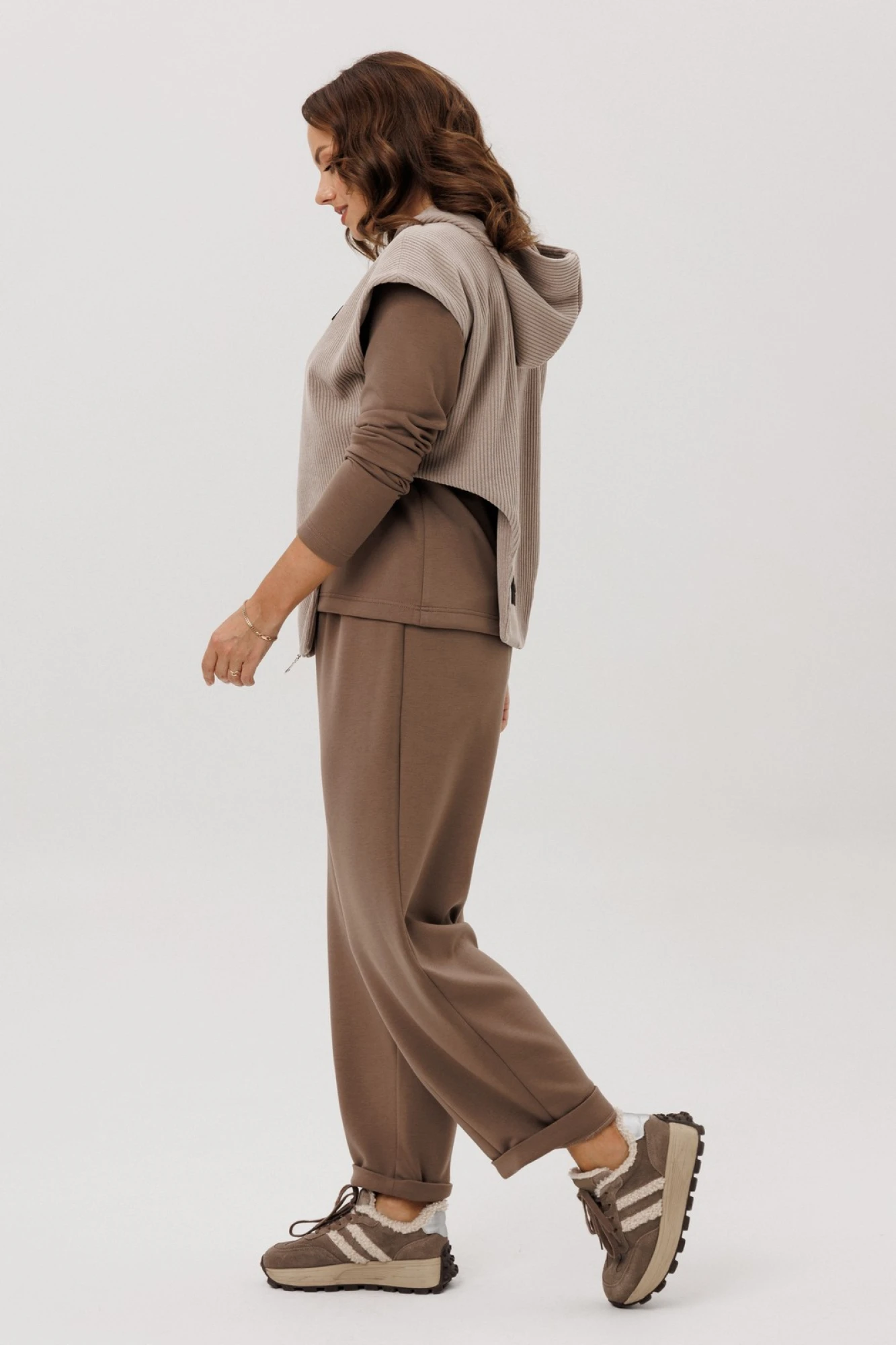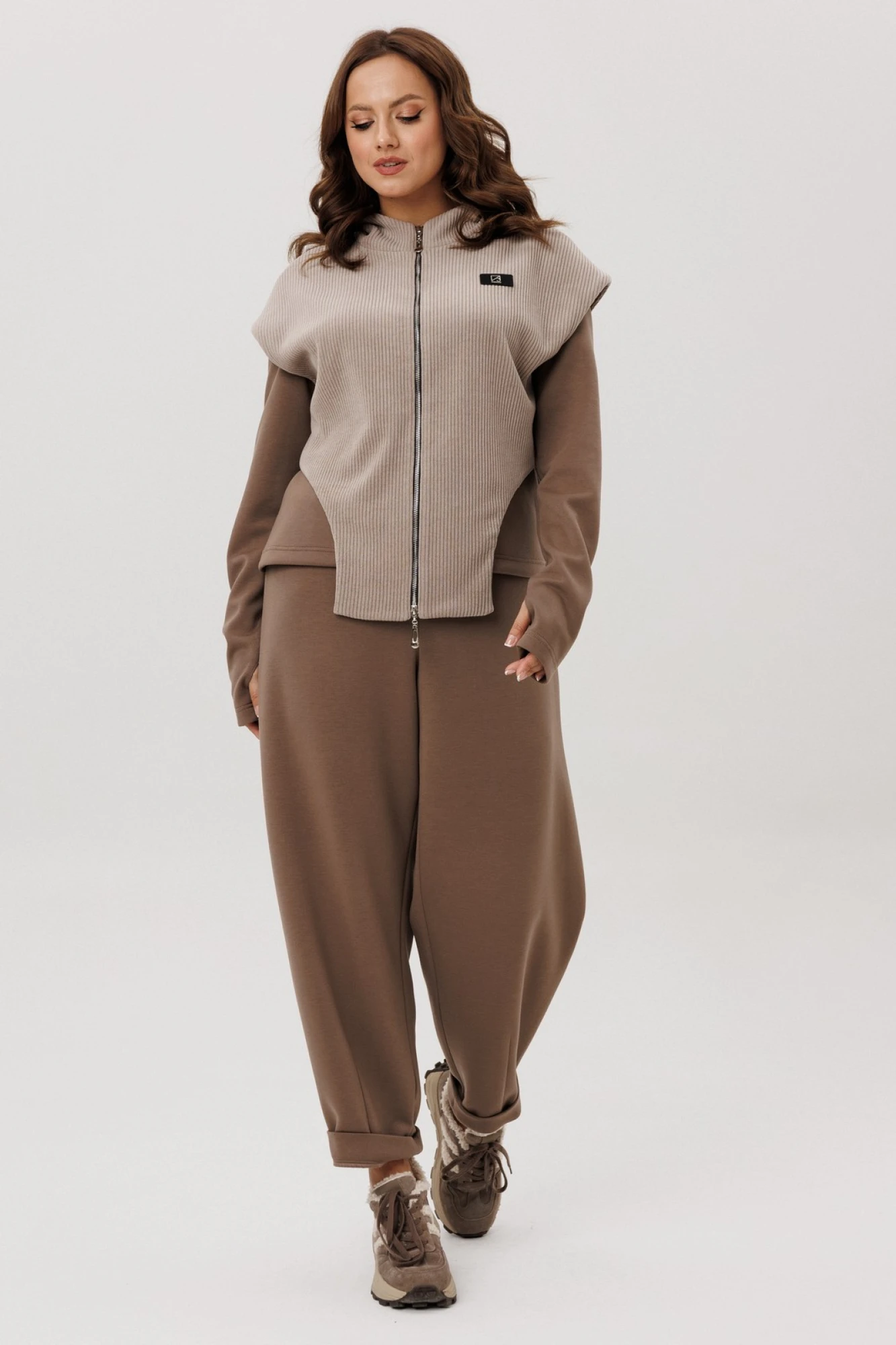 Брюки «бананы». По талии на резинке, без застежки. В боковых швах и на заднем полотнище имеются карманы. По низу брюк манжет и выточка.