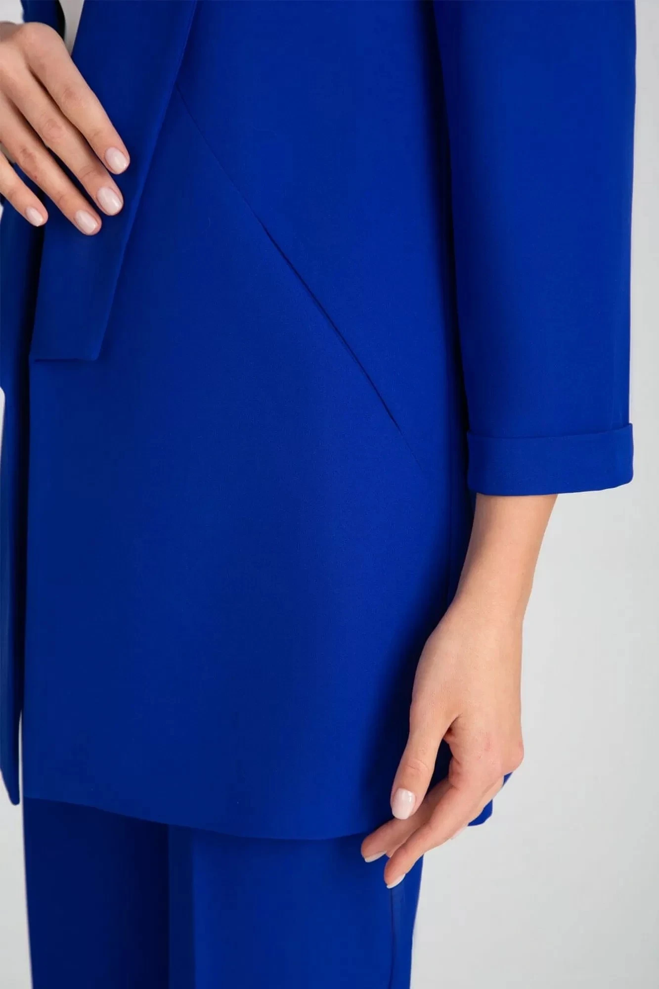 Притачные рукава 3/4 с отворотами. Спереди боковые рельефы с прорезными косыми карманами по швам рельефов.
