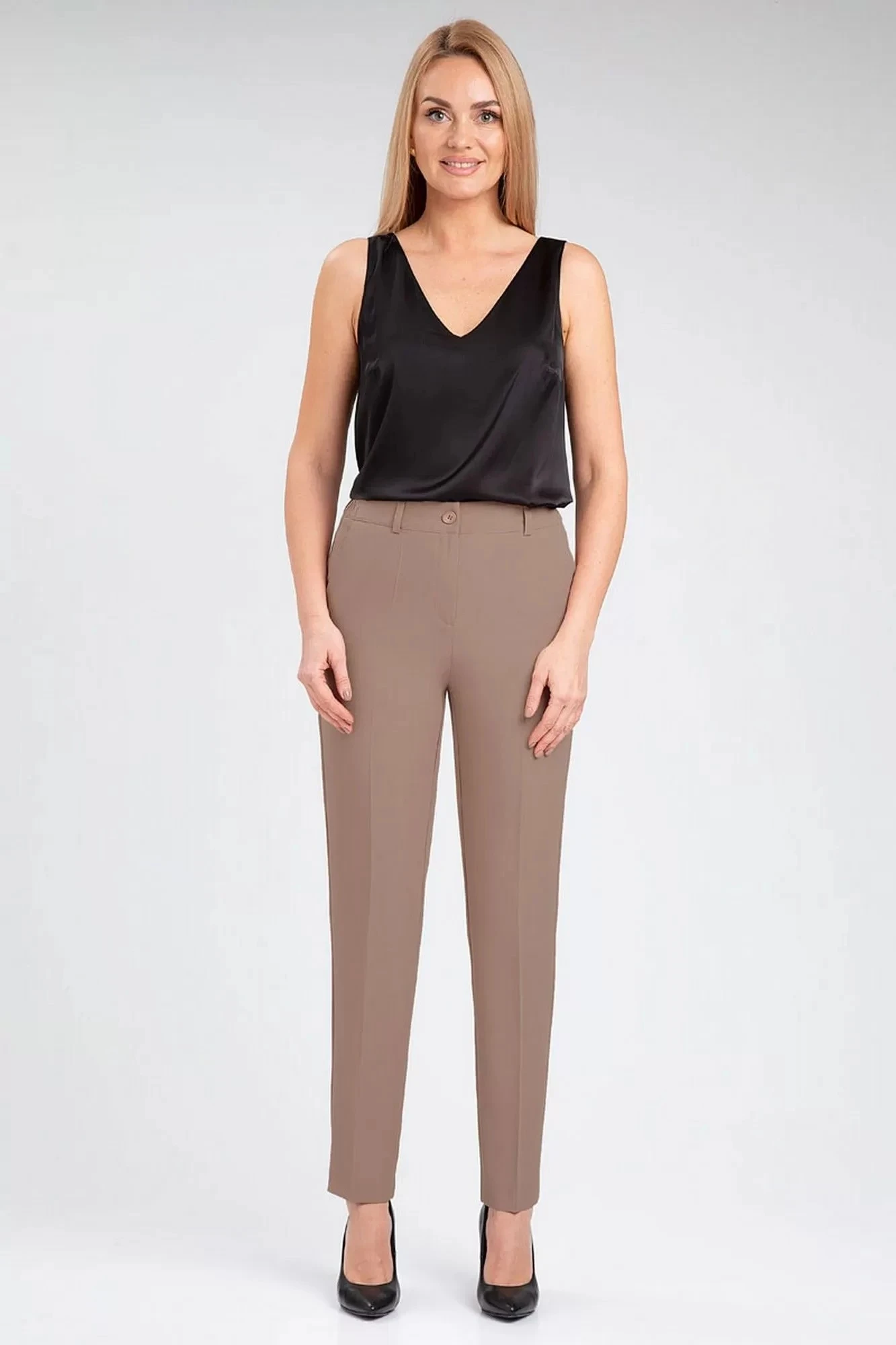 Классические брюки со стрелками, заужены к низу. Высокая посадка на талии.
